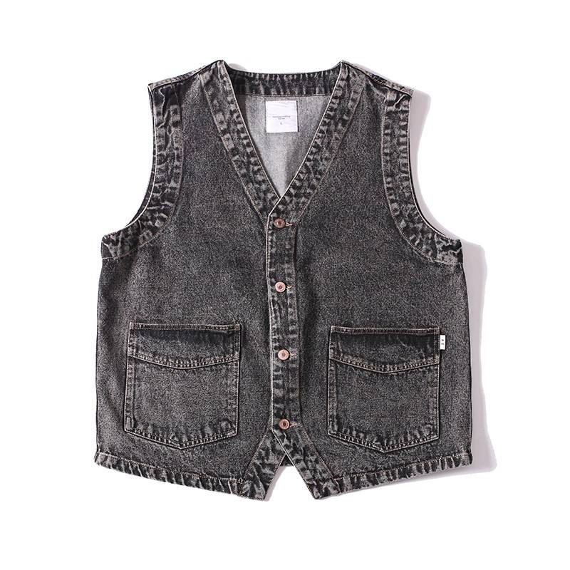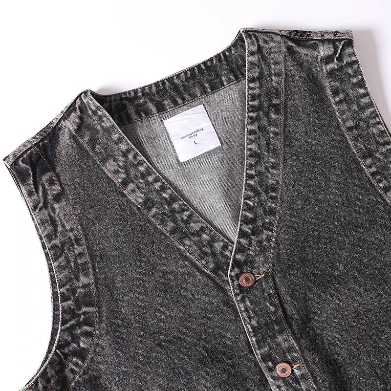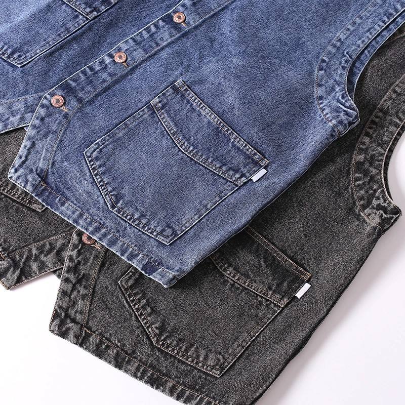 เสื้อกั๊กเดนิมทรงเรโทรสำหรับผู้ชายขายดีประจำฤดูใบไม้ร่วง ผ้าฝ้ายฟอก ซักง่าย มีกระเป๋าหลายช่อง คอวี แขนกุด สไตล์ลำลอง แฟชั่นกลางแจ้ง ระบายอากาศได้ดี