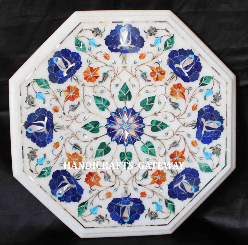 โต๊ะทานอาหารลายดอกไม้หินอ่อนสีขาวขัดเงาทรงแปดเหลี่ยมงานฝังสวยใช้ในบ้าน