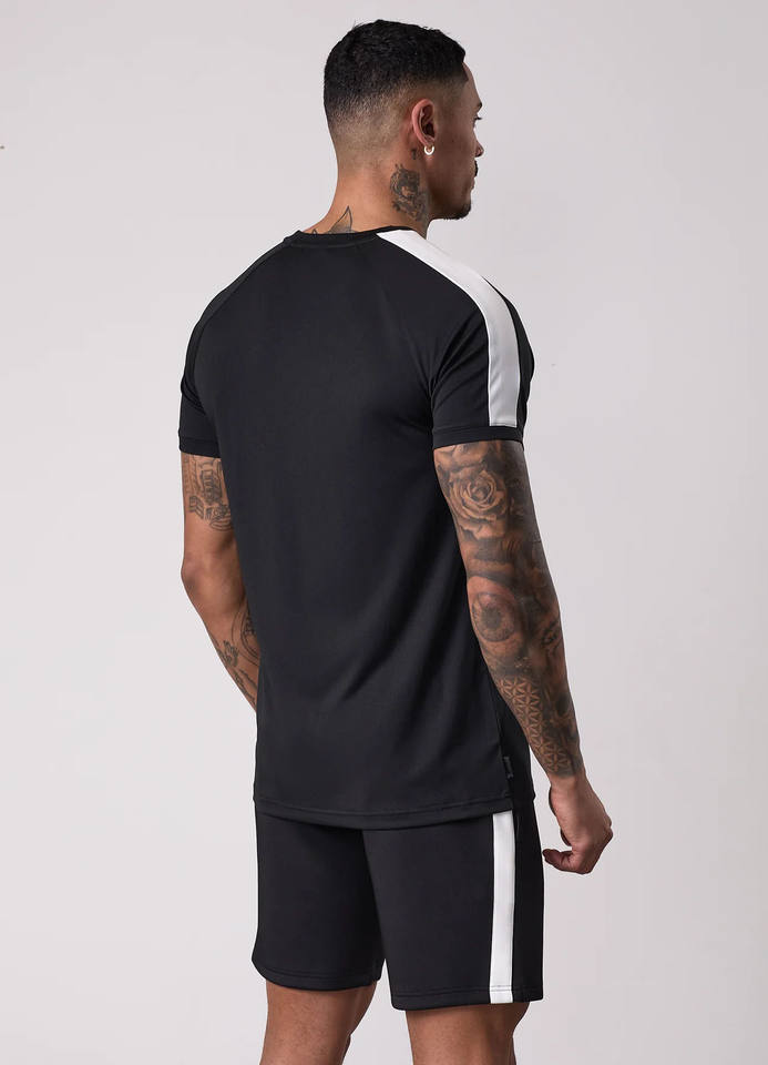 ชุดเสื้อยืดและกางเกงขาสั้นผ้าโพลีแขนสั้นทรงสลิมฟิตสีดำชุดออกกำลังกายยิมชายหาดและสตรีท