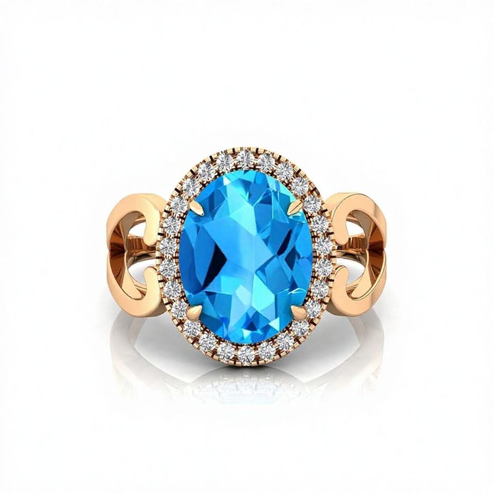 แหวนเพชรทรงวงรีสีเหลืองทอง14k ประดับพลอยบุษราคัมสวิสสีฟ้าทรงวงรีดีไซน์คลาสสิก