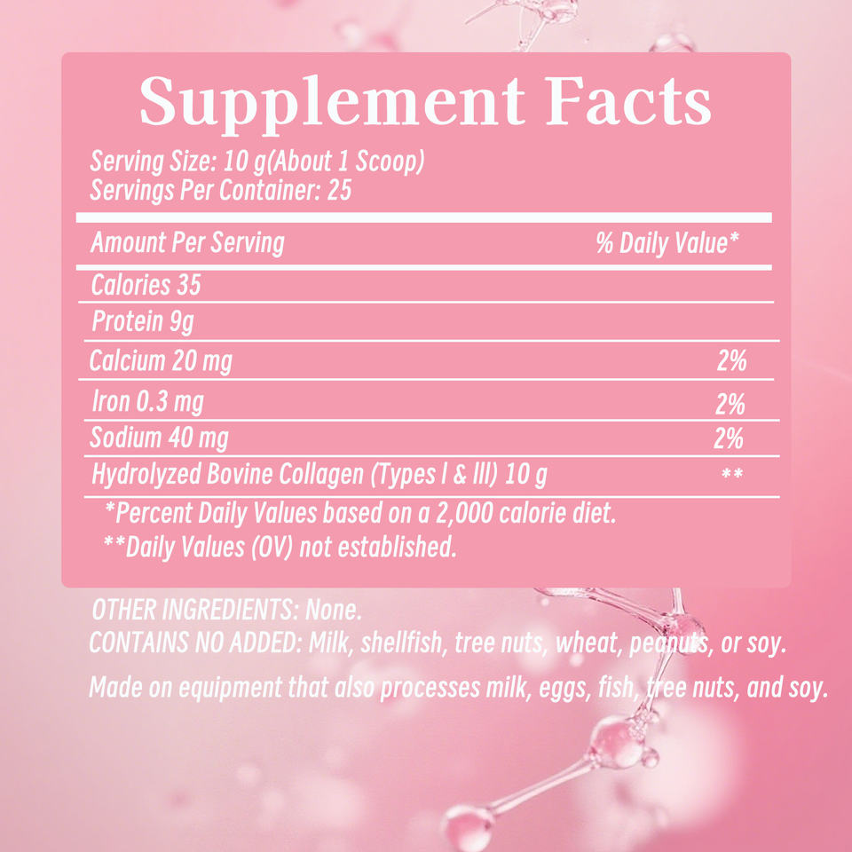 ส่วนผสมหลัก:คอลลาเจนไฮโดรไลซ์โบวีน, โซเดียม, เหล็ก, แคลเซียม, โปรตีน