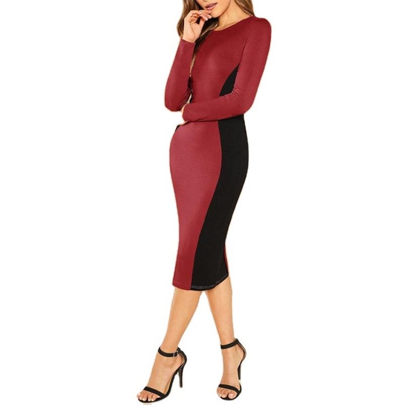 ชุดเดรสรัดรูปแขนยาวเข่าทรงดินสอสำหรับสุภาพสตรีแบบบล็อกสี