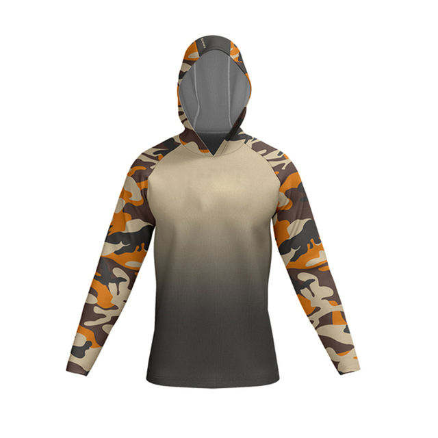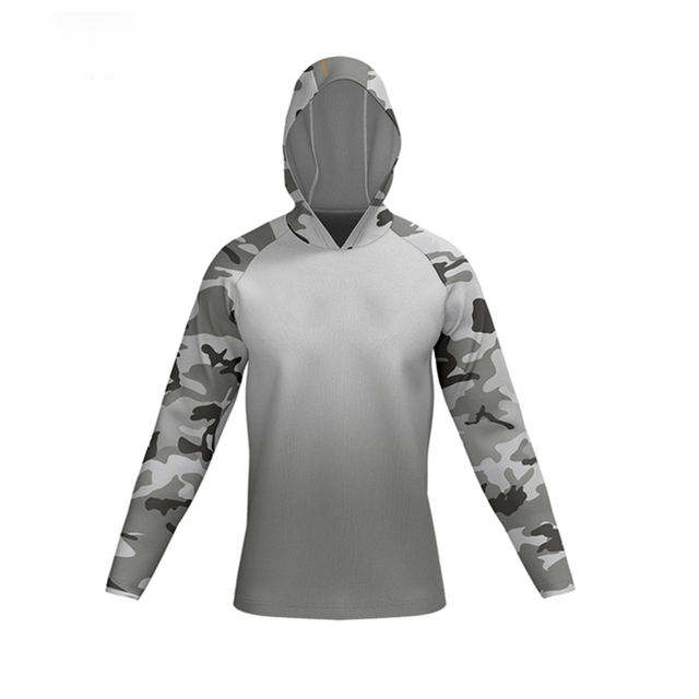 เสื้อฮู้ดดี้ตกปลาแขนยาวสำหรับผู้ชาย ลายพรางแบบกำหนดเองขายดีที่สุด ผลิตจากโพลีเอสเตอร์ 100% แห้งเร็ว ป้องกันรังสียูวี UPF50+