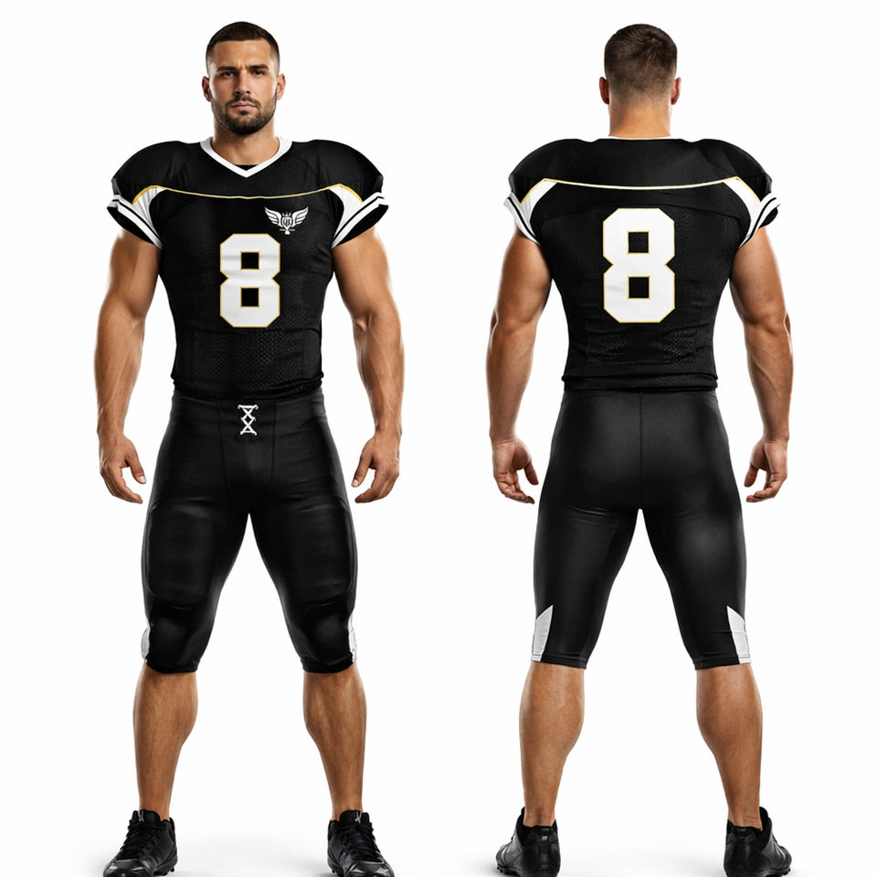 ชุดยูนิฟอร์มอเมริกันฟุตบอลแบบกำหนดเอง สีดำทอง ชุดเสื้อเจอร์ซีย์แบบซับลิเมชั่น ชื่อทีมและหมายเลขส่วนตัว ชุดฝึกซ้อมรักบี้แบบคลาสสิก