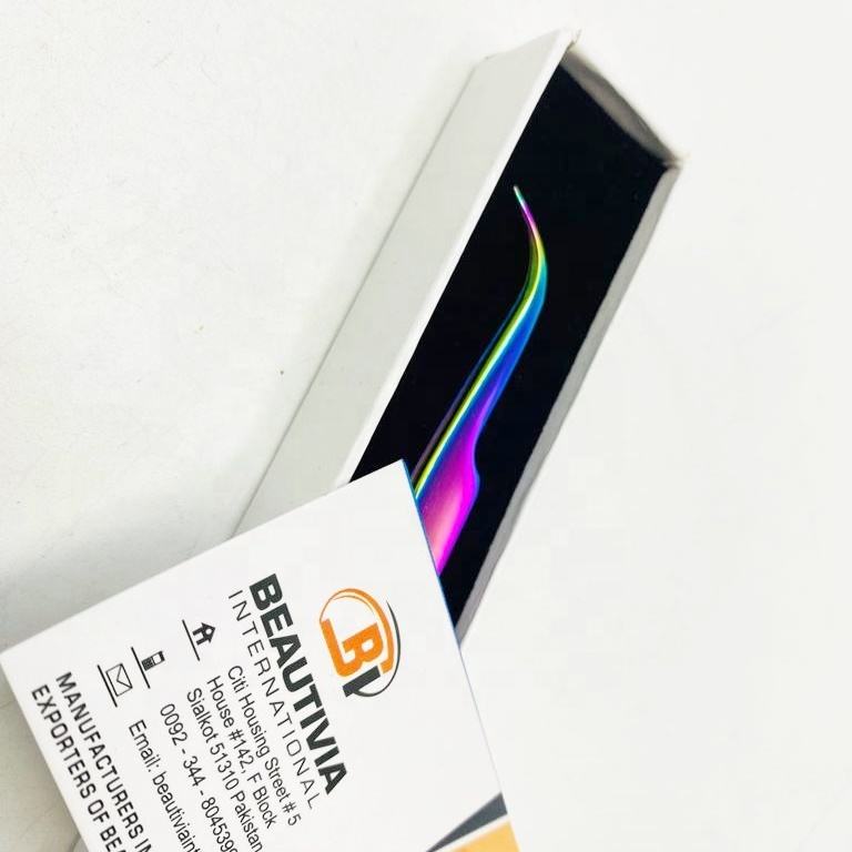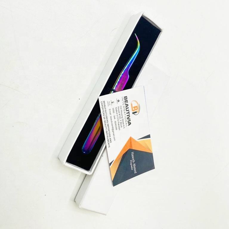 แหนบต่อขนตาสแตนเลสพลาสม่าสีรุ้งแหนบปลายแหลมแบบโค้งออกแบบโลโก้ได้ตามต้องการ