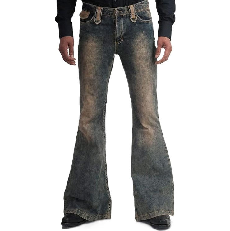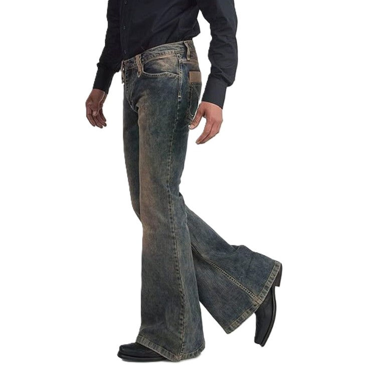 กางเกงยีนส์ทรงขาบานผู้ชายขายดีที่สุด กางเกงยีนส์ทรงกระดิ่งขาบานหลวมๆ สไตล์วินเทจฟอกสี ทรงปกติ ใส่สบายช่วงฤดูใบไม้ร่วง ผ้ามีความยืดหยุ่น
