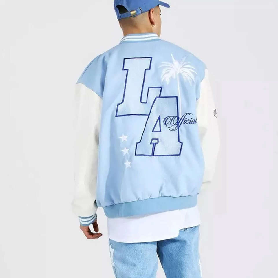 แจ็คเก็ตเบสบอลคอตั้งผ้าฟลีซสำหรับผู้ชายแบบปรับแต่งได้ ขายดีที่สุด ตกแต่งด้วยป้ายปักลายหนังวัว ตัวอักษรแบบวินเทอร์ วาร์ซิตี้