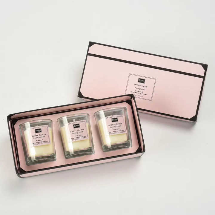ชุดเทียนหอมขายดีในขวดแก้ว ทำจากขี้ผึ้งถั่วเหลืองธรรมชาติ กลิ่นหอมอโรมาเธอราพี 3 กลิ่น พร้อมกล่องของขวัญ
