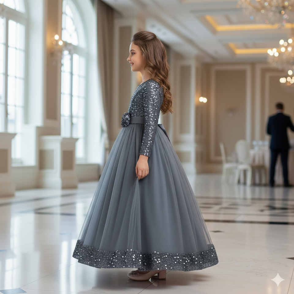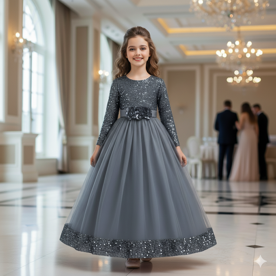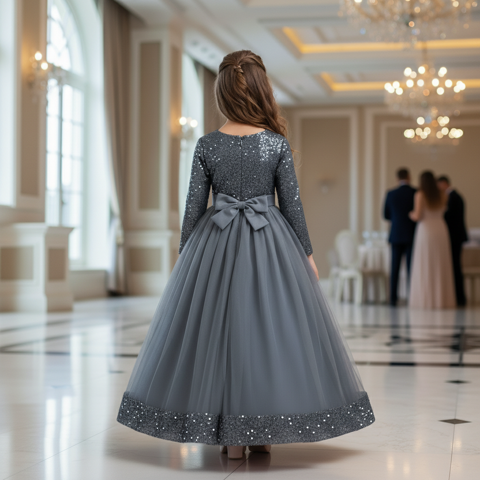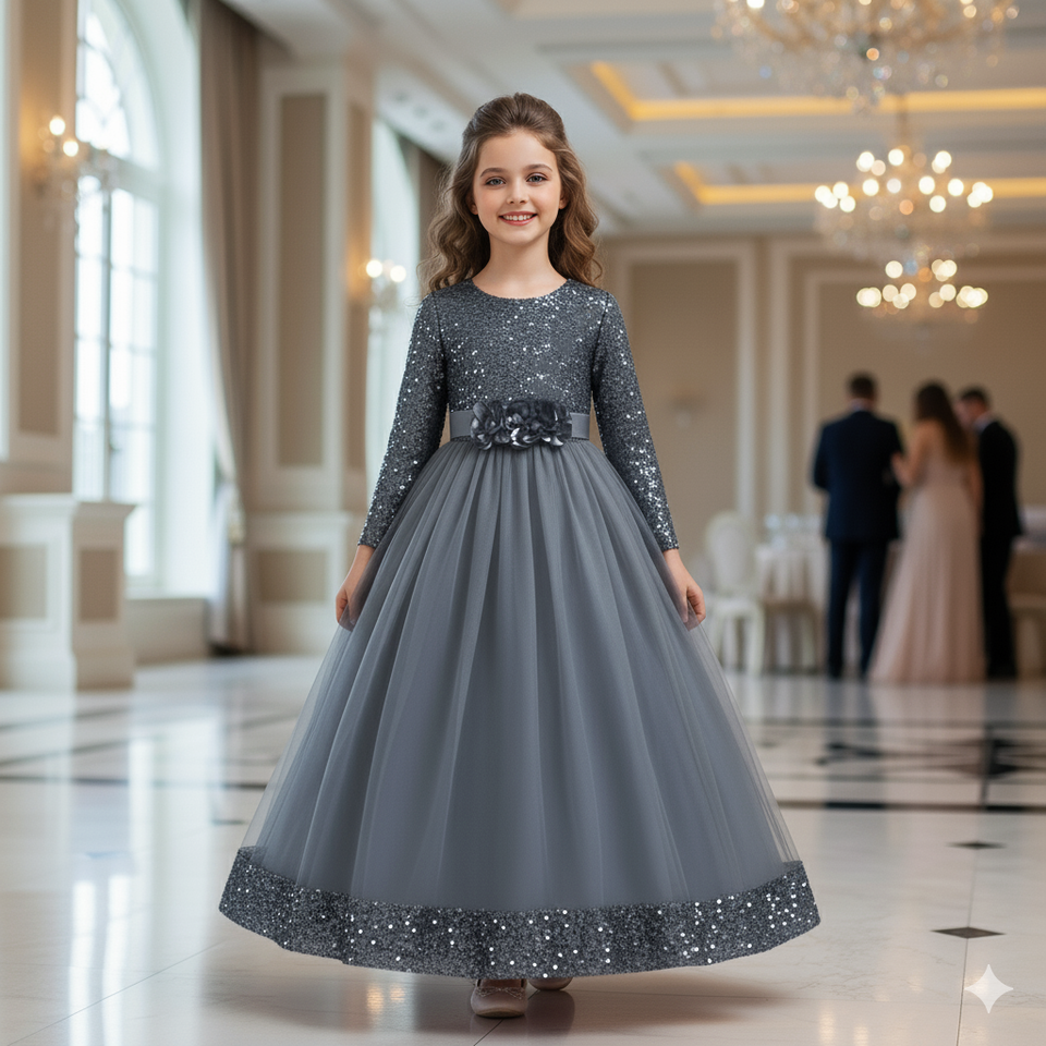 ชุดเดรสเด็กผู้หญิงสีเทาประดับเลื่อมขายดีที่สุดสำหรับงานแต่งงาน ชุดราตรีงานวันเกิดเด็กปักลายกำมะหยี่หรูหรา ชุดสำหรับงานพิธีการ