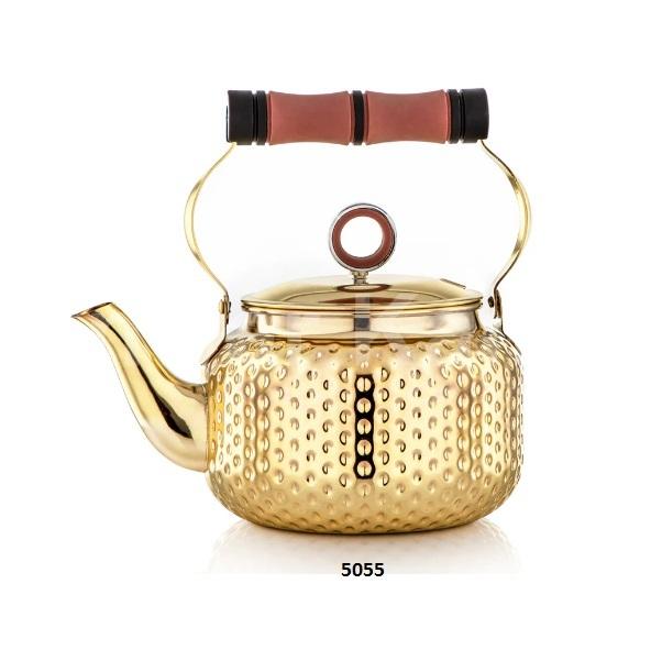 กาน้ำชาสแตนเลสแบบมีฝาปิดสีทองทำจากเหล็กทุบมีฝาปิดและที่จับไม้มีสไตล์สำหรับตกแต่งโต๊ะอาหาร