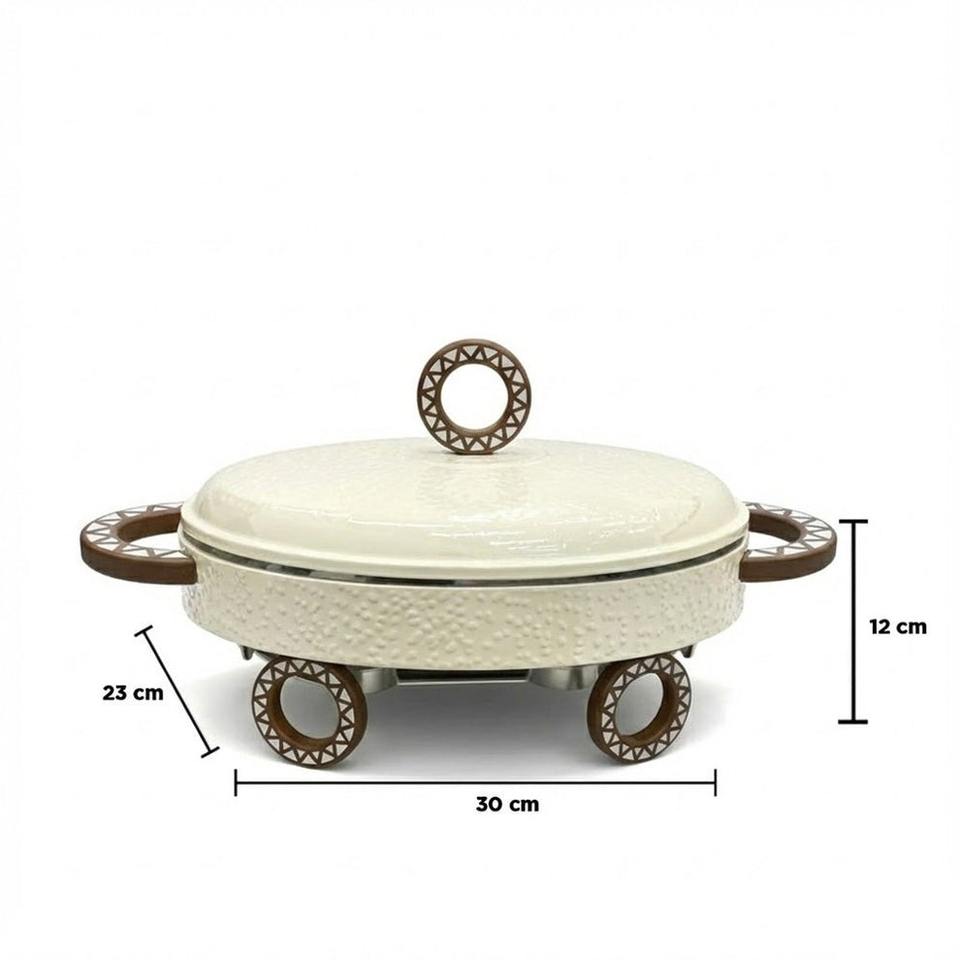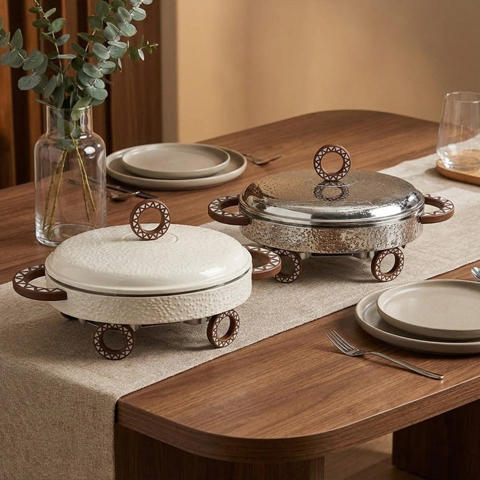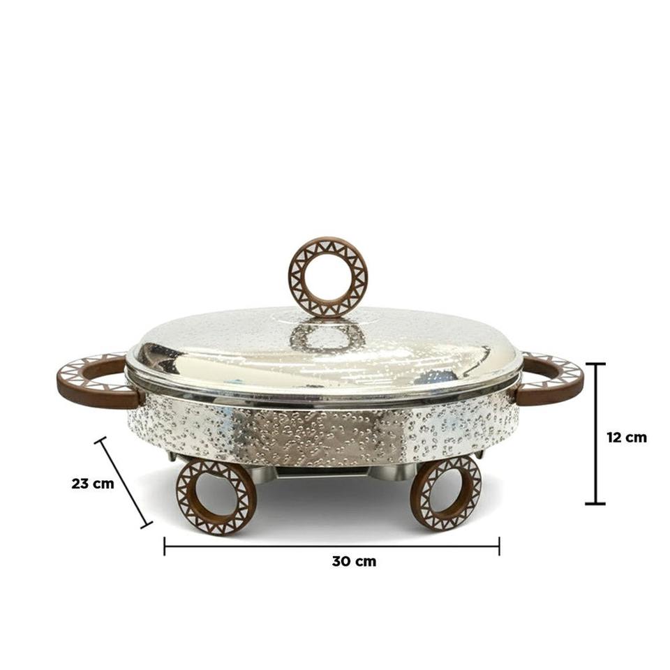 ถาดอุ่นอาหารเงินตอกลายขายดี พร้อมฐานล้อตกแต่งและหูจับลวดลาย สำหรับบริการจัดเลี้ยงบุฟเฟ่ต์สุดหรู