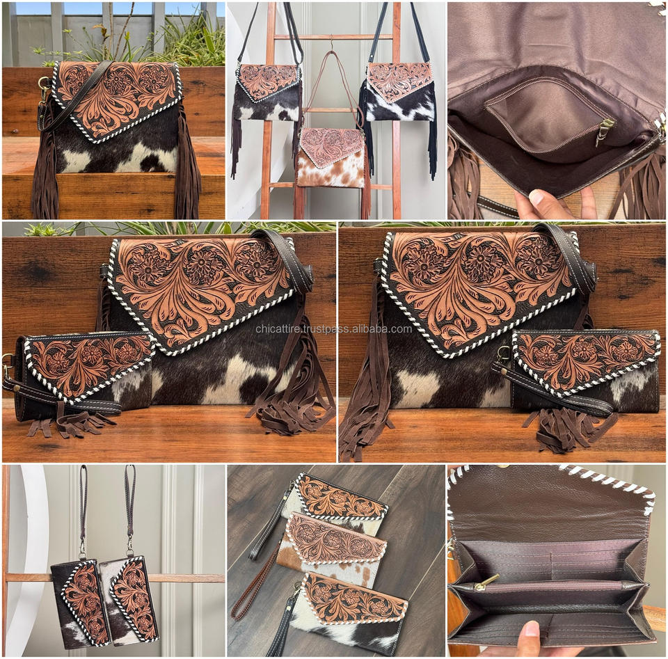 Product name:Hand Tooled Leather Cowhide Fringe Bag & Clucth Combo Set