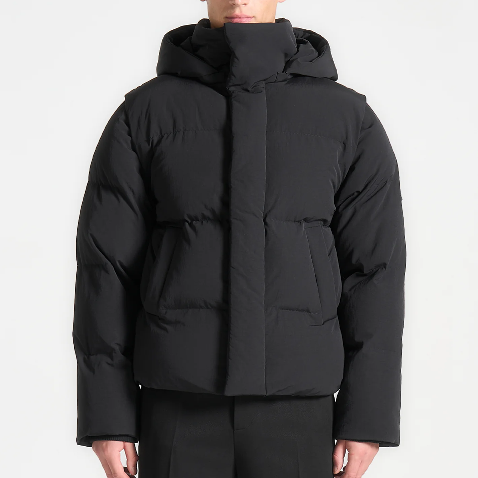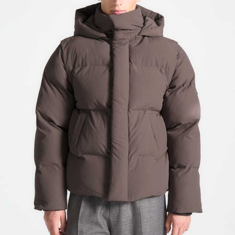 แจ็กเก็ตขนปลาปักเป้ามีฮู้ดสำหรับผู้ชายสีทึบสำหรับใช้กลางแจ้งฤดูหนาวทำตามสั่ง