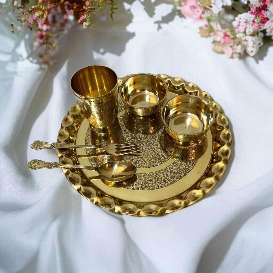 ชุดถาดทองเหลืองอินเดียคุณภาพสูงขายดี ดีไซน์ดั้งเดิม สำหรับเสิร์ฟอาหารและใช้ในพิธีกรรมทางศาสนา สำหรับการส่งออก