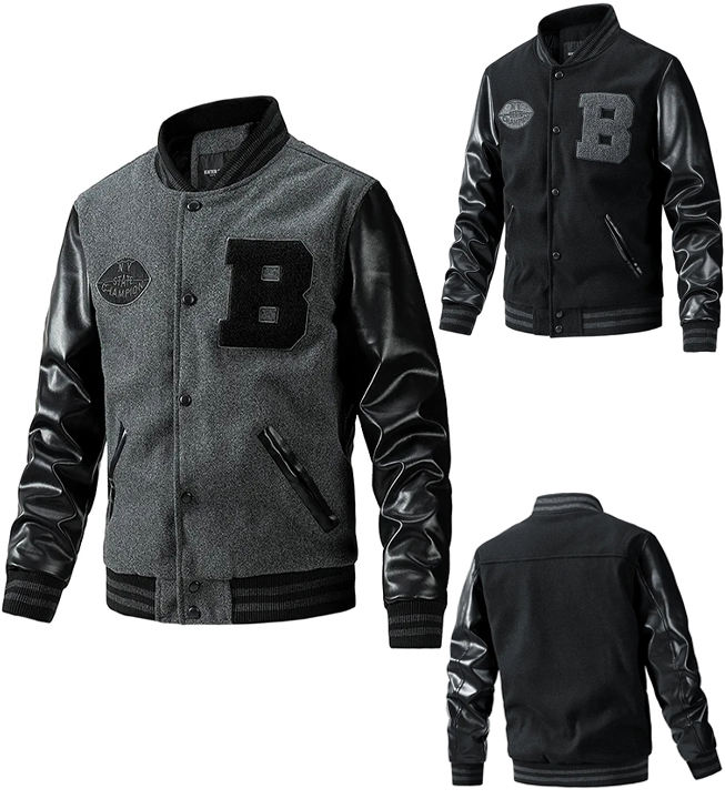แจ็กเก็ตเบสบอลทีมโรงเรียนมีตัวอักษรคอตั้งและโลโก้ด้านหน้าสำหรับผู้ชายย้อมสีเรียบใส่ได้ตามต้องการ