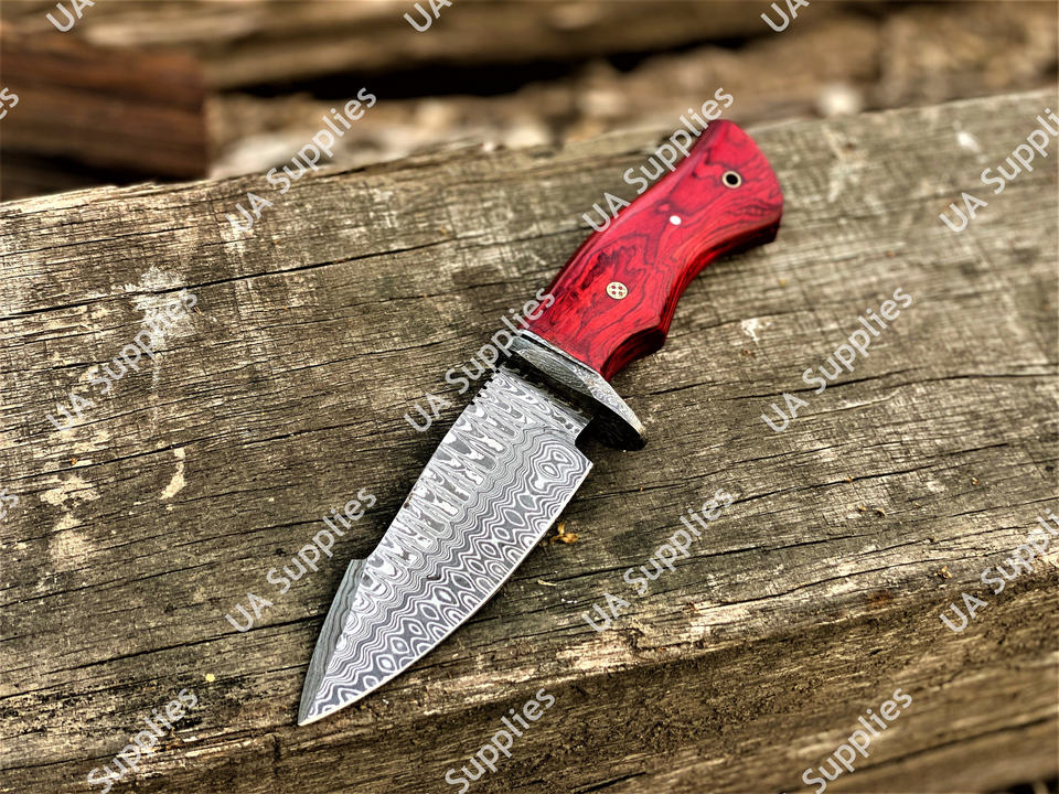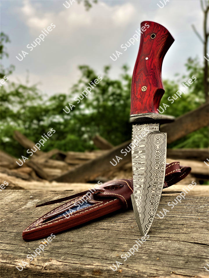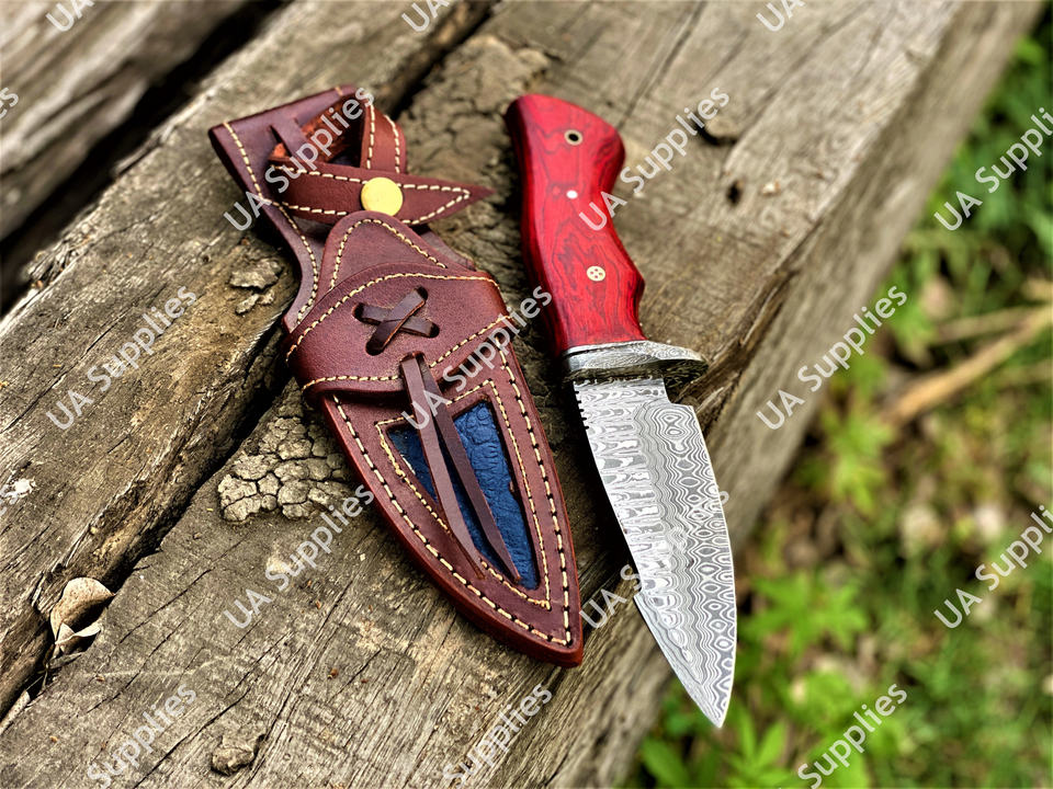 มีดแค้มปิ้งกลางแจ้งใบมีดเหล็กดามัสกัสเกรดอุตสาหกรรมขายดีที่สุด ด้ามไม้ปักก้า ปลอกหนัง รับผลิตแบบ OEM