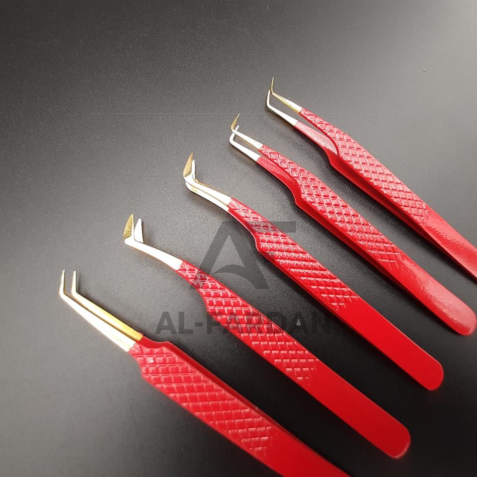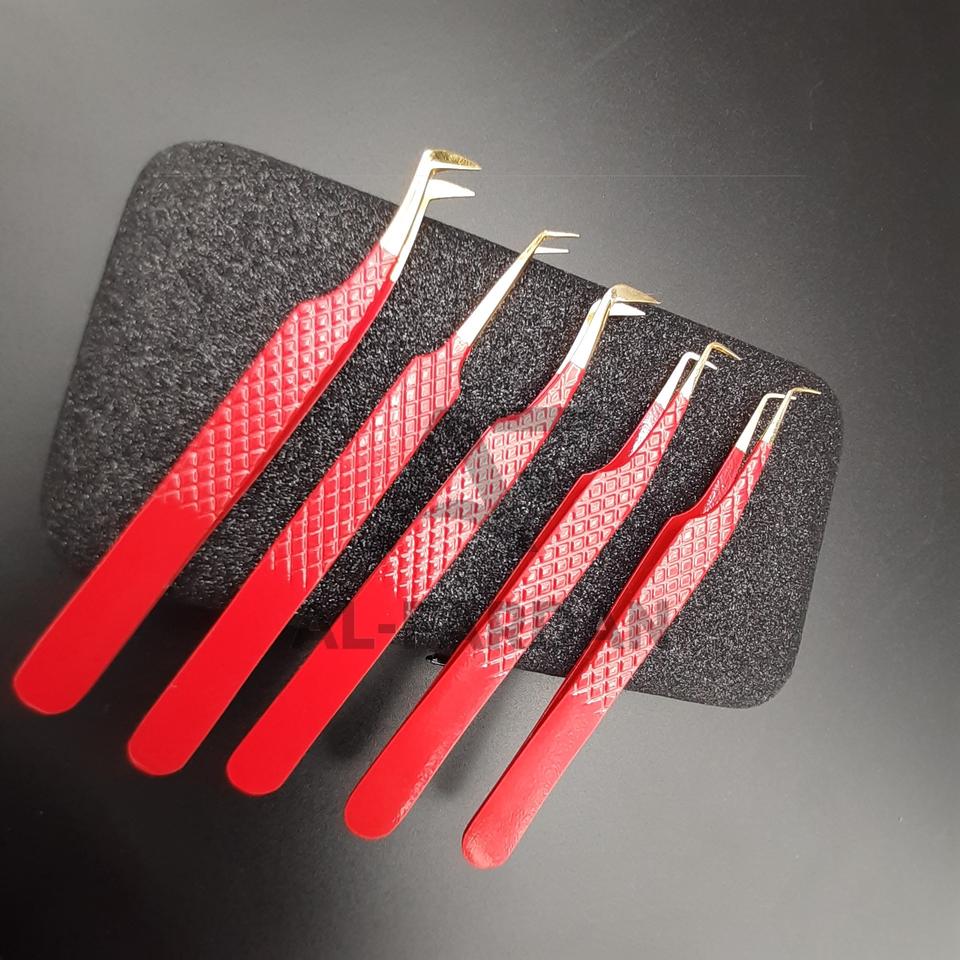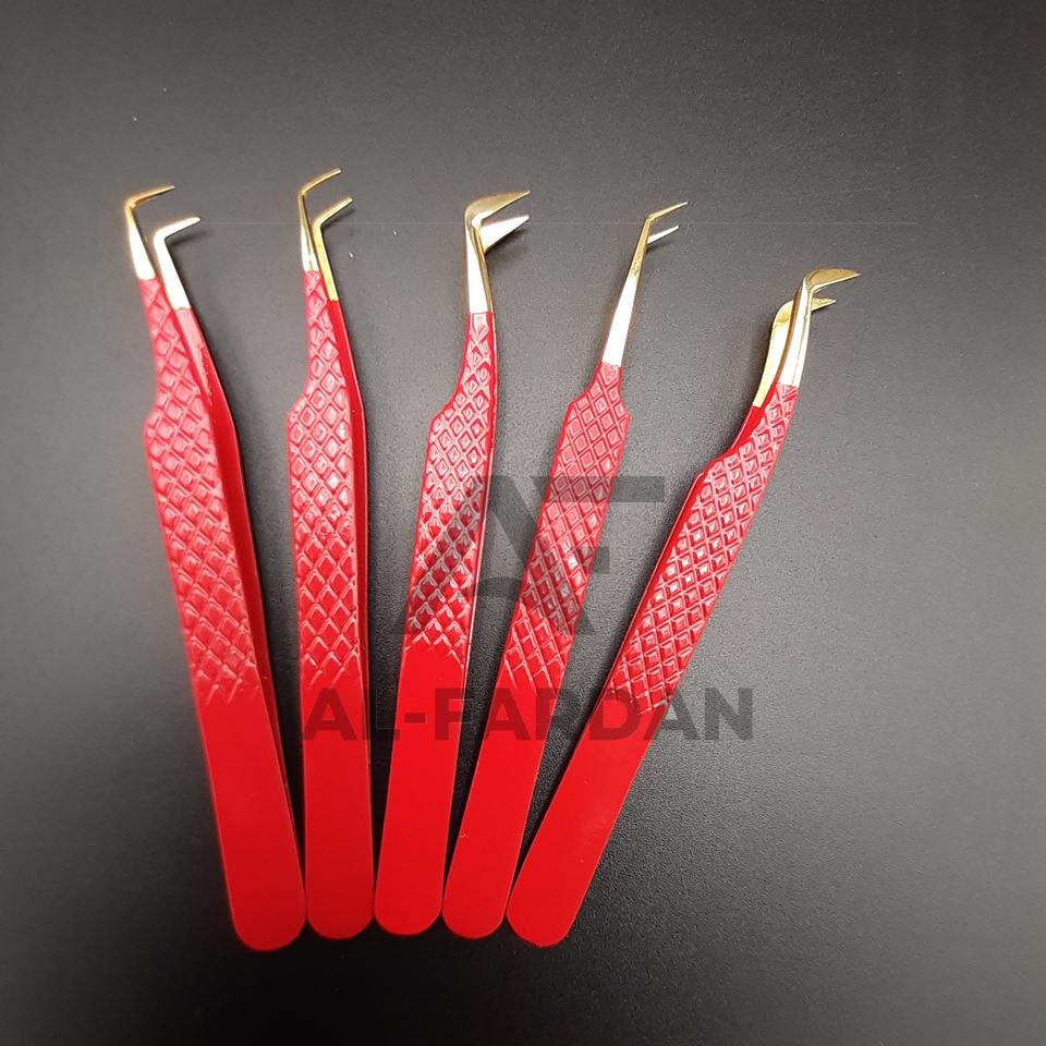 แหนบต่อขนตาสแตนเลสคุณภาพสูงขายดี สีแดง ปลายแหลมสีทอง ด้ามจับเพชร ผ่านการทดสอบด้วยมือ ทนทาน