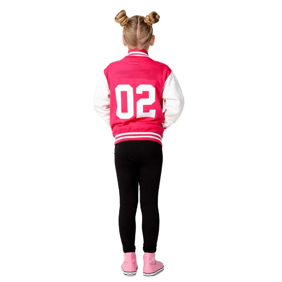 แจ็กเก็ตหนังมหาวิทยาลัยสำหรับเด็กสไตล์สตรีทสีชมพูปักโลโก้ด้วยกระดุมย้อมสีล้วนสำหรับเล่นกีฬาฤดูหนาว