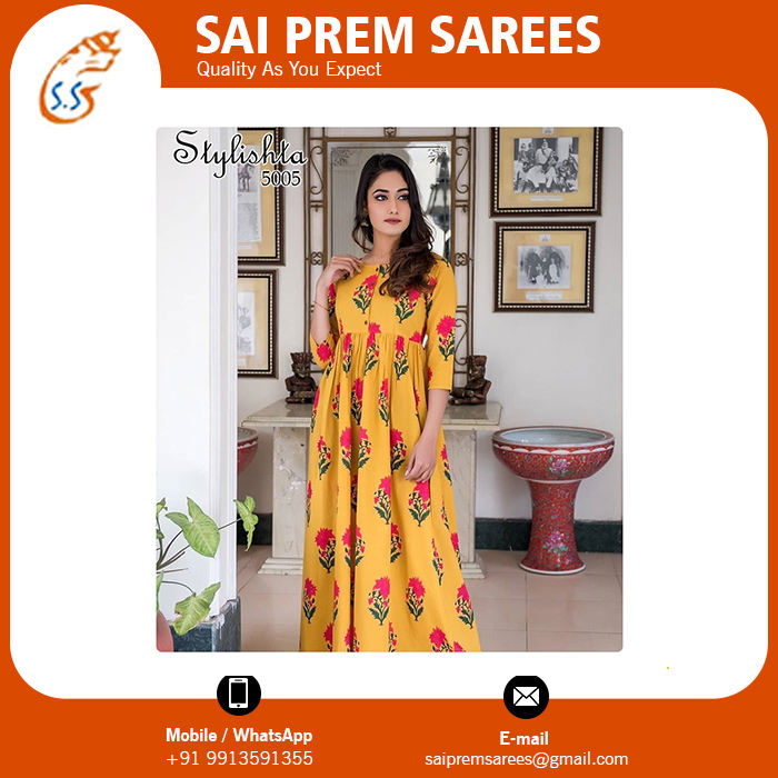 Best Selling Ladies Floral Print Floor Length Kurti Gown 100% Pure Cotton Silk Saree Dress Stitched at Best Wholesale Price