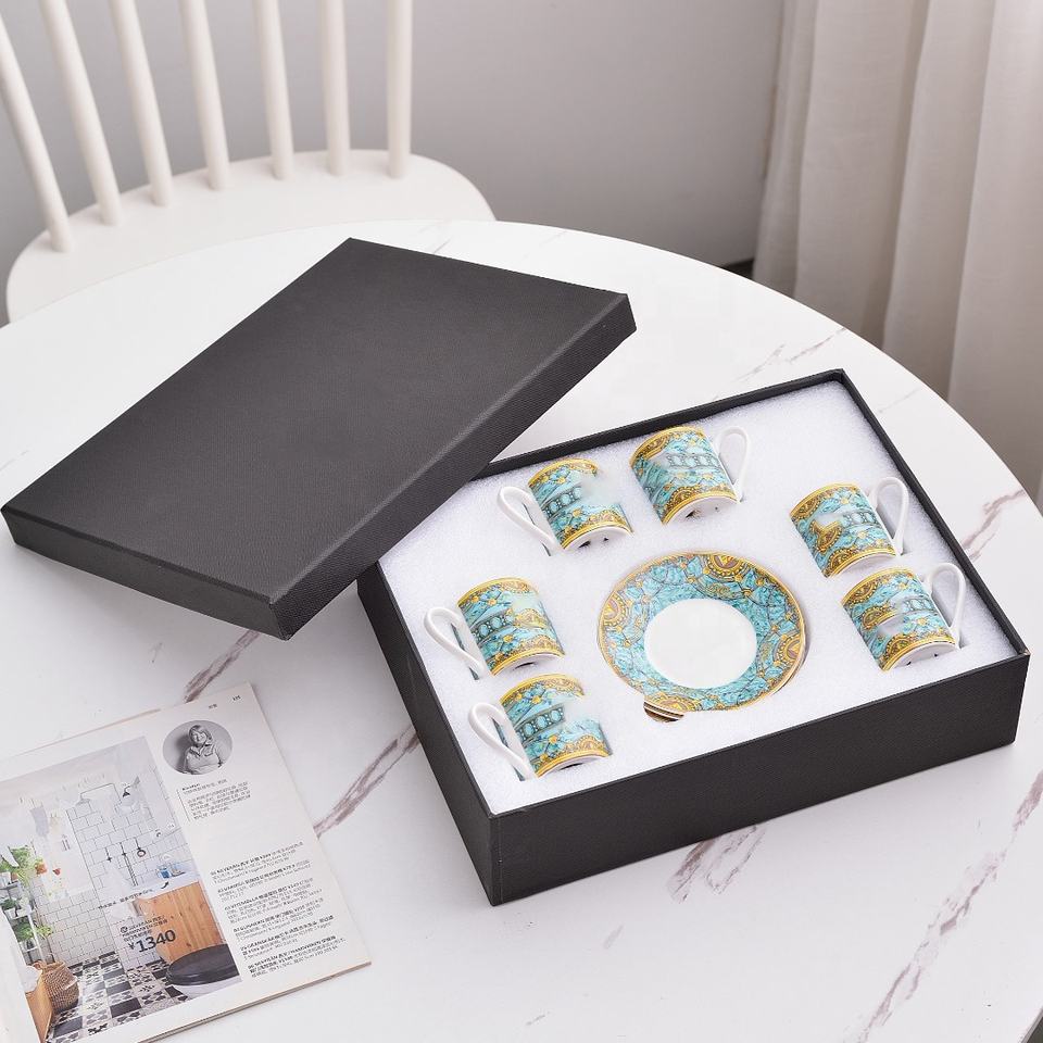 6ถ้วยและจานรองเครื่องลายครามเข้มข้นหรูหรา