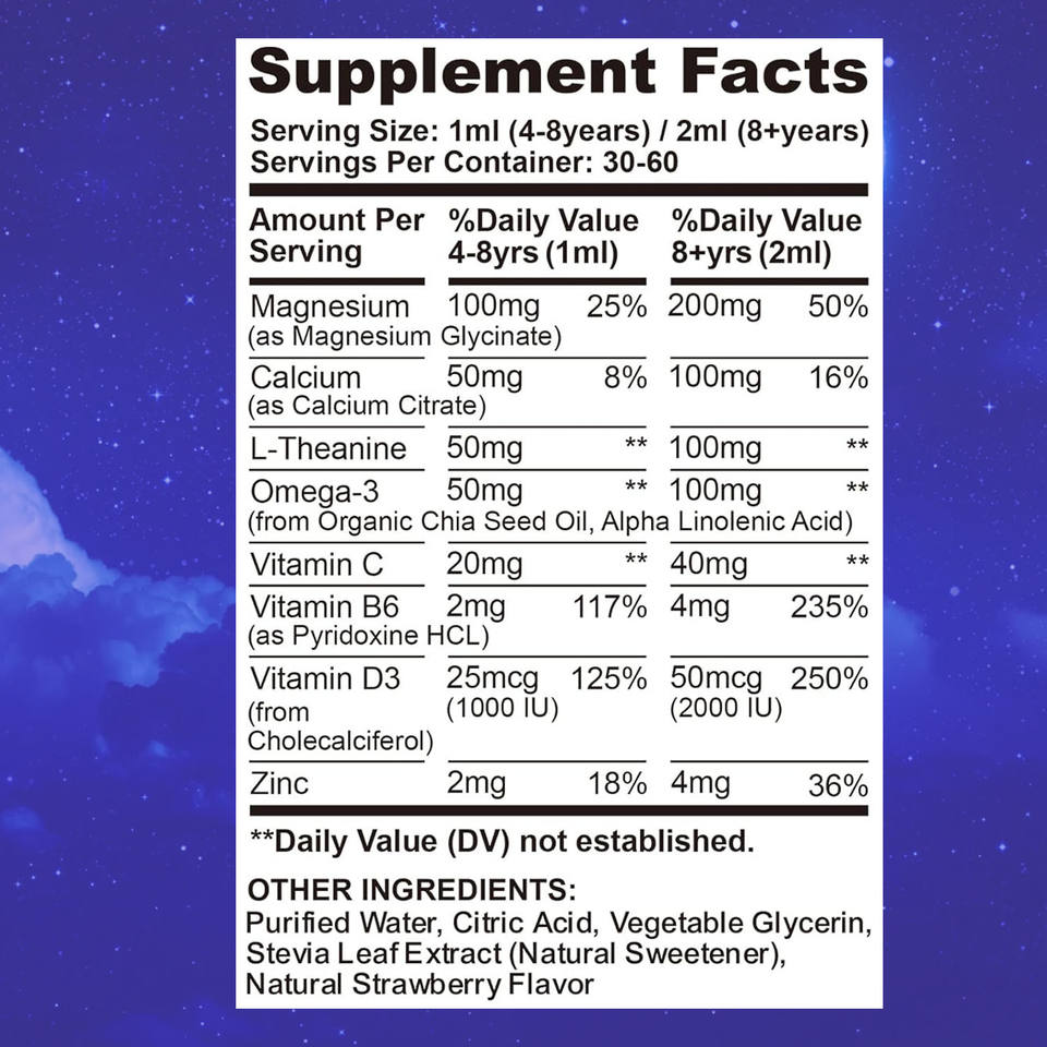 ส่วนผสมหลัก:แมกนีเซียม, แคลเซียม, แอล-ธีอะนีน, วิตามินซี, วิตามินบี 6, โอเมก้า 3, สังกะสี, วิตามินดี3