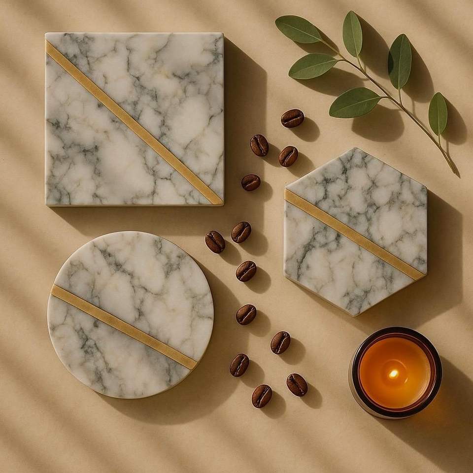 ชุดที่รองแก้วหินอ่อนที่มีรูปลักษณ์ทันสมัยเหมาะสำหรับห้องครัวทันสมัยและพื้นที่นั่งเล่นร่วมสมัยที่มีสไตล์
