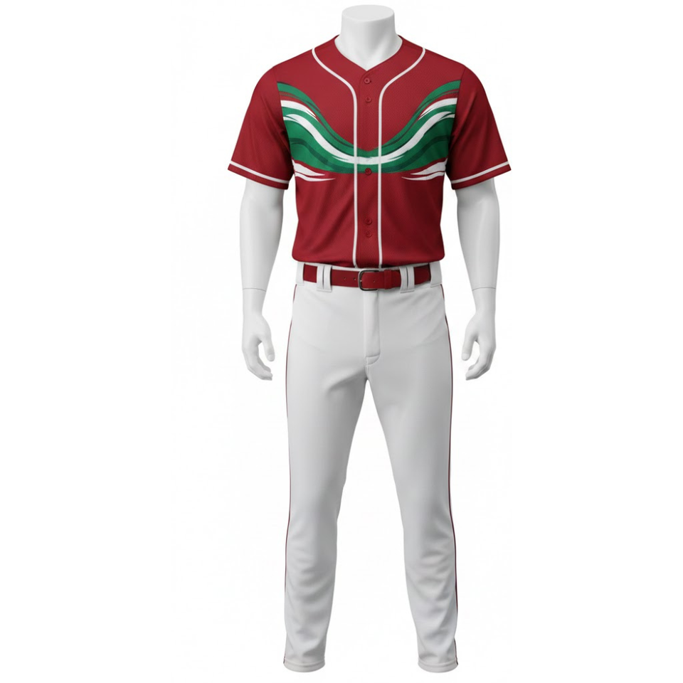 ชุดยูนิฟอร์มเบสบอลสีแดงเลือดหมูขายดี พร้อมเสื้อเจอร์ซีย์ลายคลื่นสีเขียวขาวแบบซับลิเมชั่น และกางเกงขายาวมีแถบข้างสีขาวพร้อมเข็มขัด