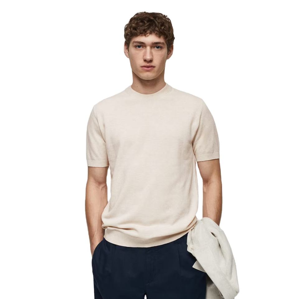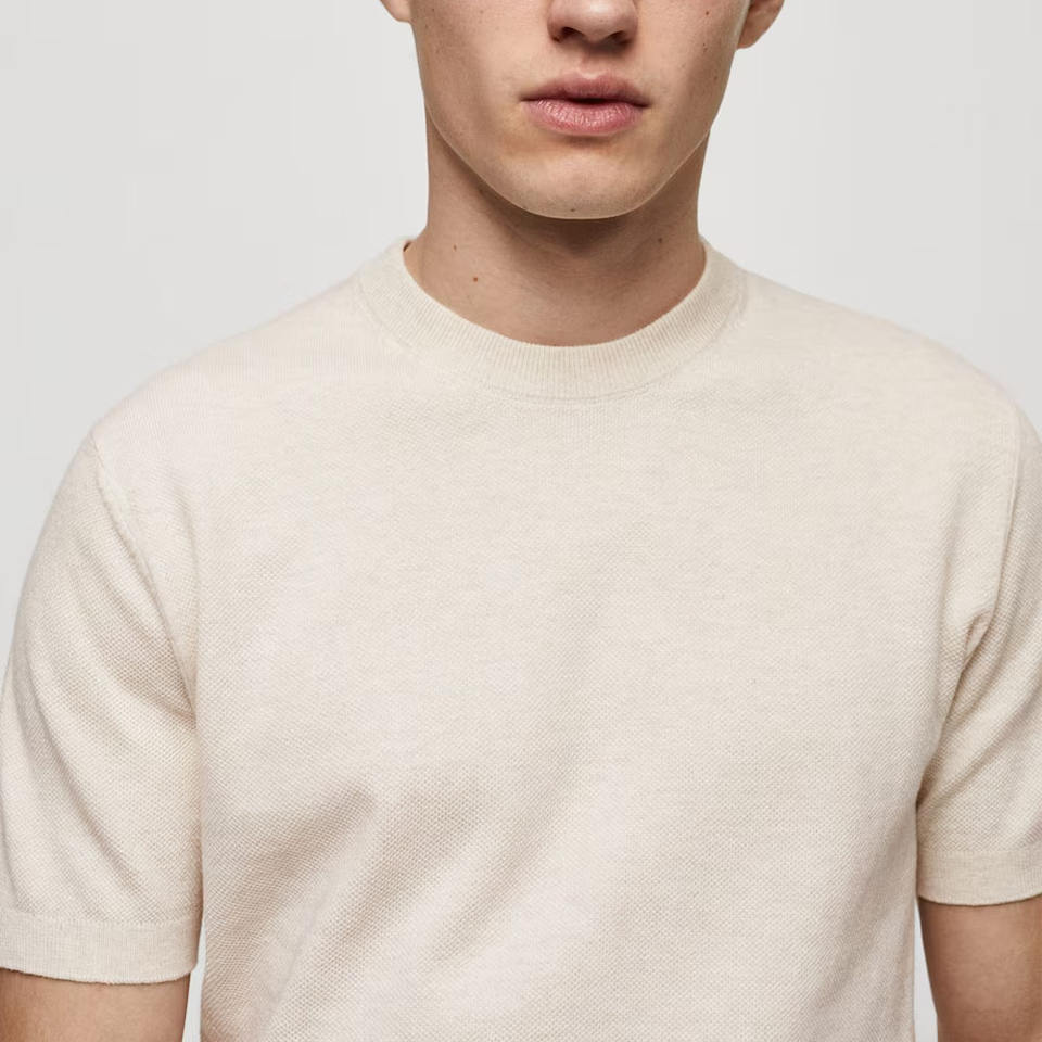 ผู้ชายที่ขายดีที่สุดสีเบจถักผ้าฝ้ายโครงสร้างเสื้อยืดพอดีบางกับคอจําลองสําหรับขายผู้ชายเสื้อยืดผ้าฝ้ายเปล่า
