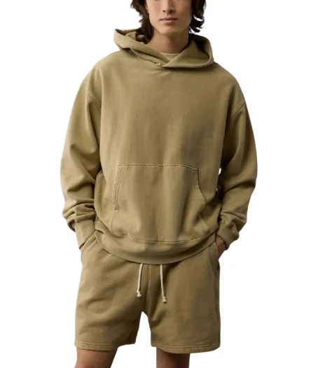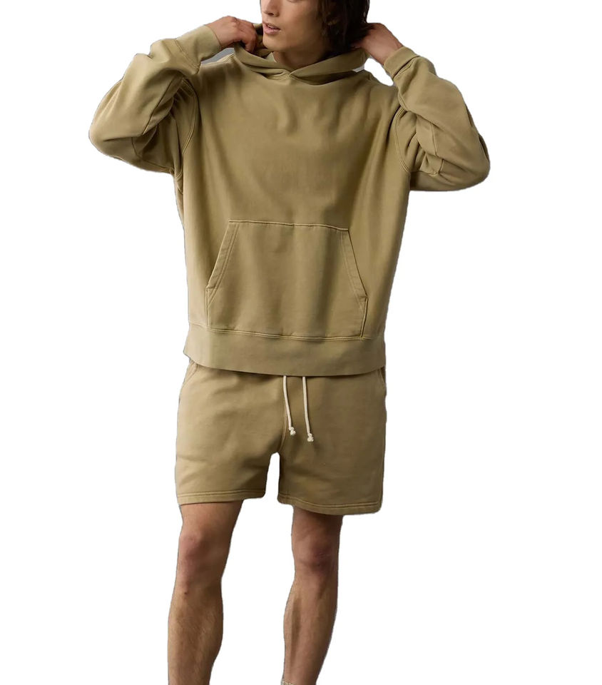 ชุดเซ็ตเสื้อฮู้ดดี้แขนตกและกางเกงขาสั้นขายดีสำหรับผู้ชาย ผ้าฝ้ายฟลีซ 100% แบบเรียบง่าย สวมใส่สบาย ทรงโอเวอร์ไซส์ สำหรับผู้ชาย