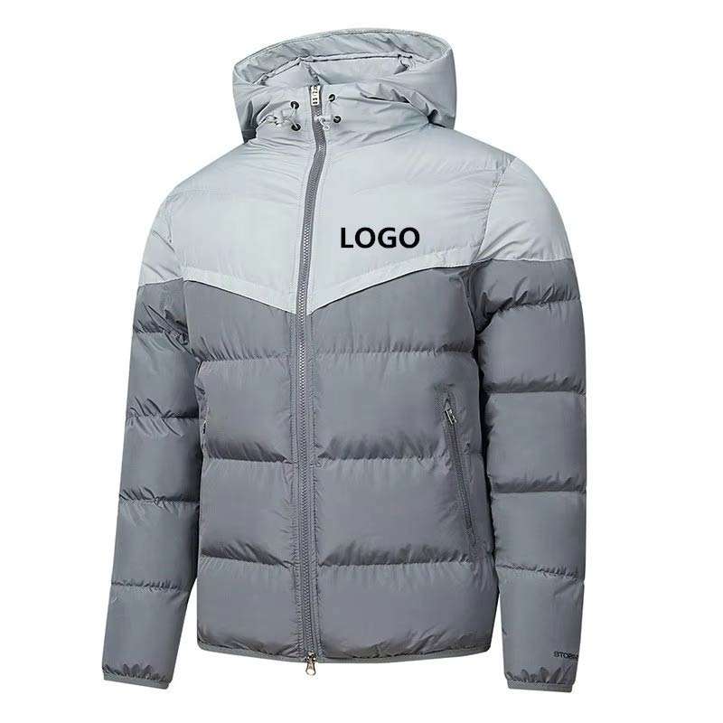 เสื้อแจ็คเก็ตพัฟเฟอร์ผู้ชายขายดี สีเทา แฟชั่นสำหรับฤดูหนาว บุด้วยผ้าฝ้าย มีฮู้ด อุ่น หนา พร้อมโลโก้