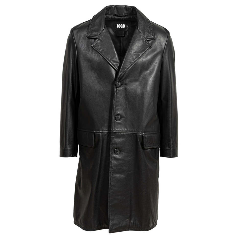 เสื้อโค้ทหนังผู้ชายขายดีที่สุด เสื้อโค้ทยาวทรงเทรนช์ แต่งกระดุมอย่างดี พร้อมโลโก้สั่งทำพิเศษ เสื้อโค้ทหนังคุณภาพสูง ไซส์ใหญ่