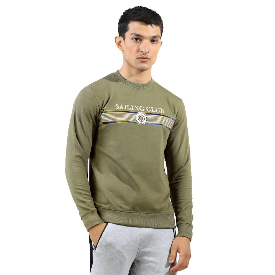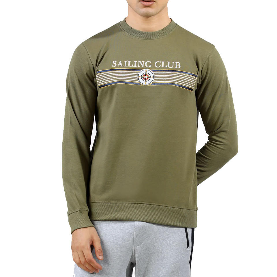 เสื้อสเวตเตอร์คอกลมสำหรับผู้ชายสีเขียวมะกอกผ้าฟลีซนุ่มปักโลโก้ด้านหน้าผลิตตามสั่งสำหรับฤดูหนาว