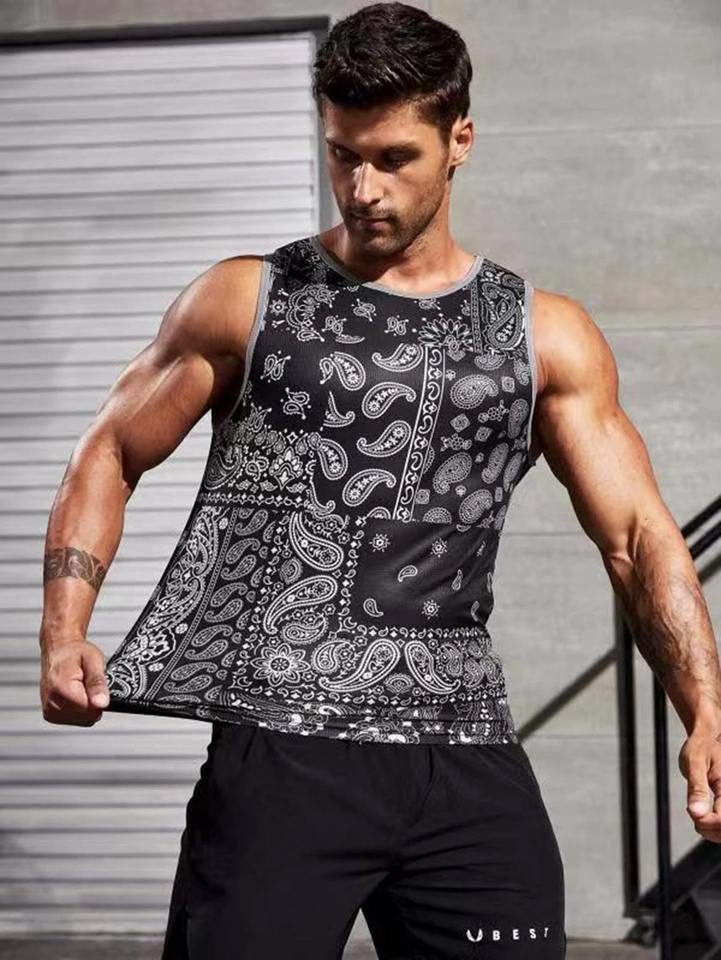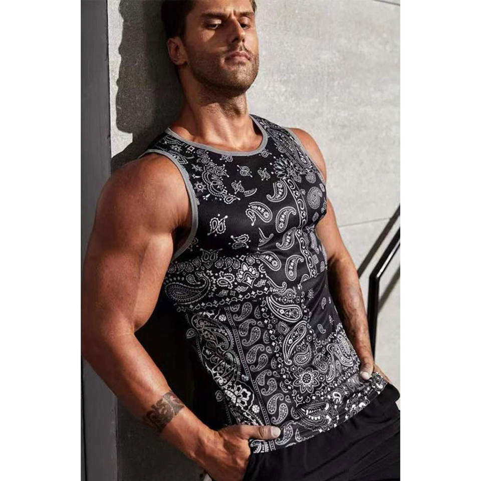 เสื้อกล้ามโพลีเอสเตอร์พิมพ์ลายสำหรับผู้ชายเสื้อกล้ามพิมพ์ลายพิมพ์โลโก้ผลิตเองได้จากโรงงานอุปกรณ์ออกกำลังกายแบบไร้รอยต่อรุ่นใหม่