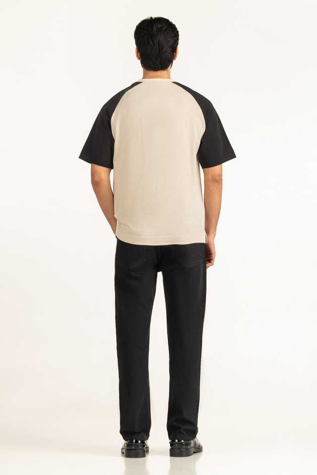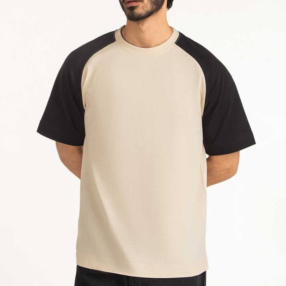 เสื้อยืดผู้ชายขายดีจากปากีสถาน เสื้อยืดแขนสั้นทันสมัยแบบสองสี แขนเสื้อสีดำ ตัวเสื้อสีเบจ