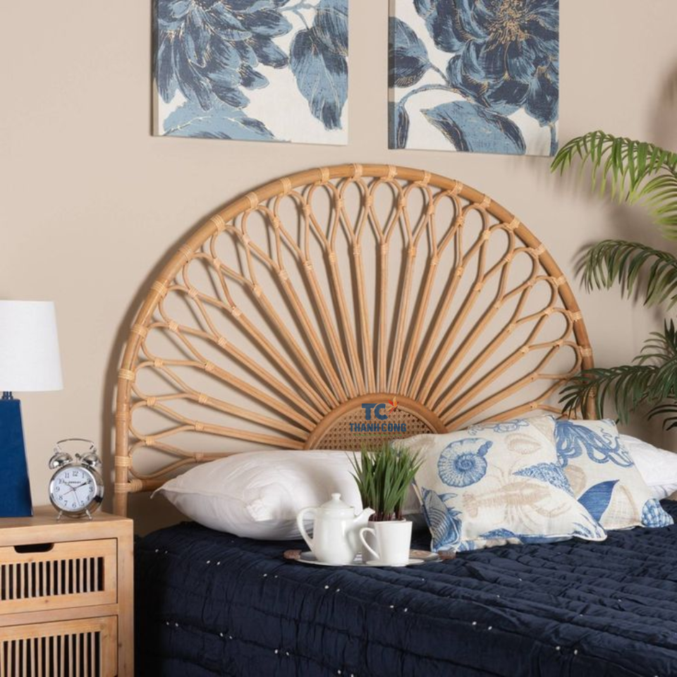 หัวเตียงหวายแบบมินิมอลขายดีที่สุด เป็นมิตรกับสิ่งแวดล้อม สำหรับเตียงควีนไซส์ ดีไซน์โค้งรูปพัด ทำด้วยมืออย่างประณีต ผลิตในเวียดนาม