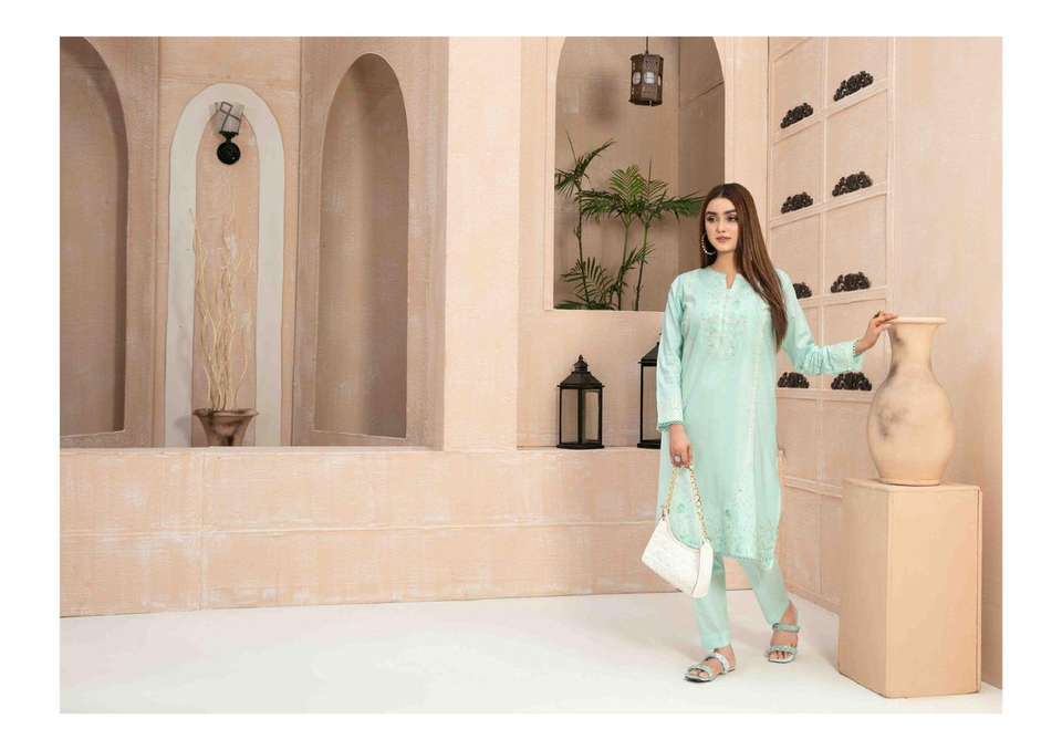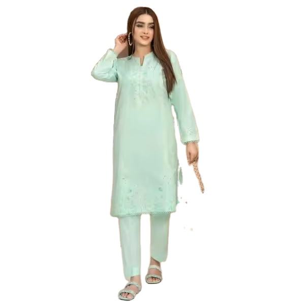 ชุดผ้าฝ้าย2ชิ้นสำหรับผู้หญิงคอสูงสีธรรมชาติระบายอากาศได้ดีตราปากีสถาน