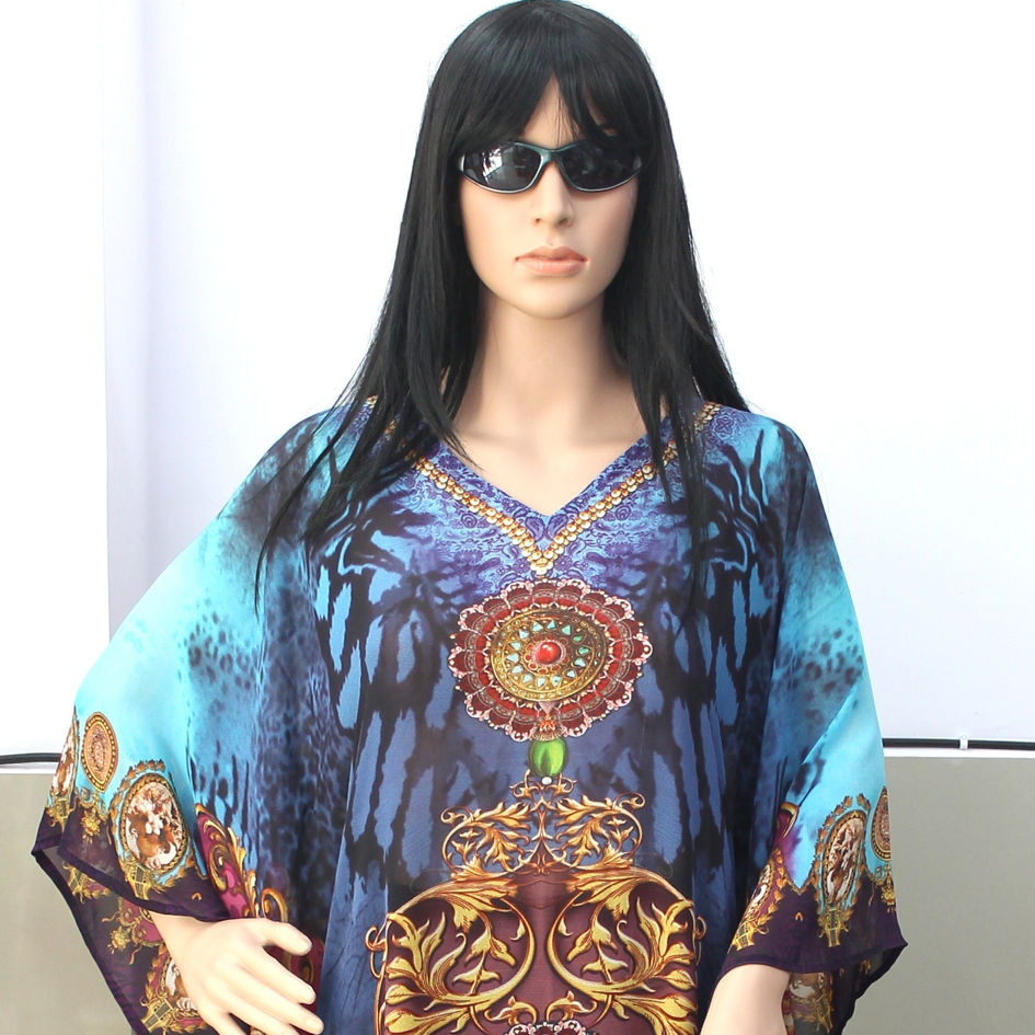 ชุดเดรสยาวทรงคาฟทันผ้าโพลีจอร์เจตต์ขายดีที่สุด เอวต่ำ เป็นมิตรกับสิ่งแวดล้อม พิมพ์ลายดิจิทัลสวยงาม ทรงชายหาด แต่งลูกไม้