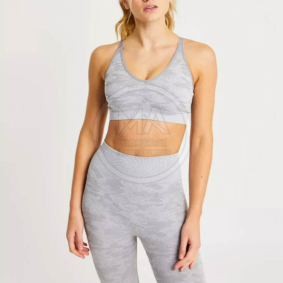 ชุดโยคะสำหรับผู้หญิงแบบมืออาชีพ2ชิ้นเอวยางยืดลายพื้นมาใหม่