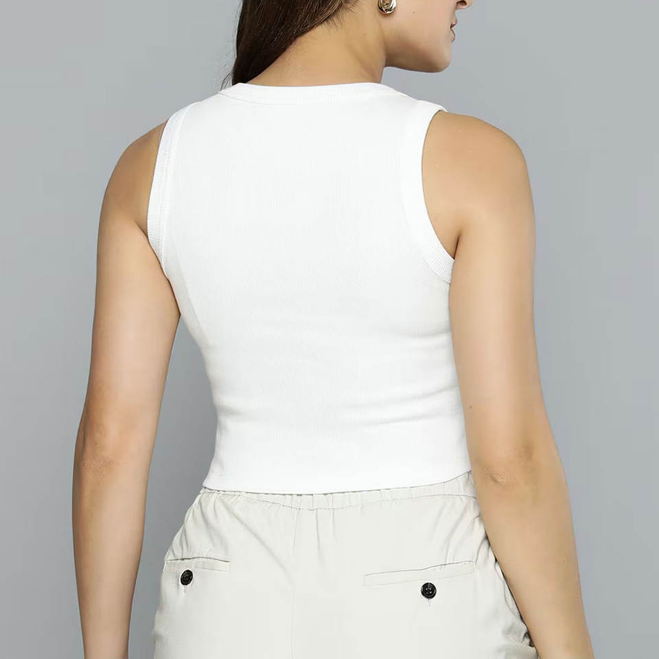 เสื้อครอปถักเนื้อนุ่มขายดีที่สุด ดีไซน์คอกลม คอสูง แขนกุด เพื่อลุคฤดูร้อนที่ดูเพรียวบาง