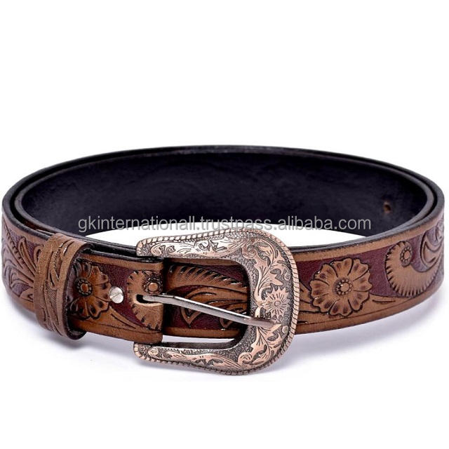 เข็มขัดหนังวัวแบบตะวันตกลายเต็มสำหรับผู้ชายชุดหัวเข็มขัดแบบโบราณดีไซน์ลายดอกไม้ทันสมัย