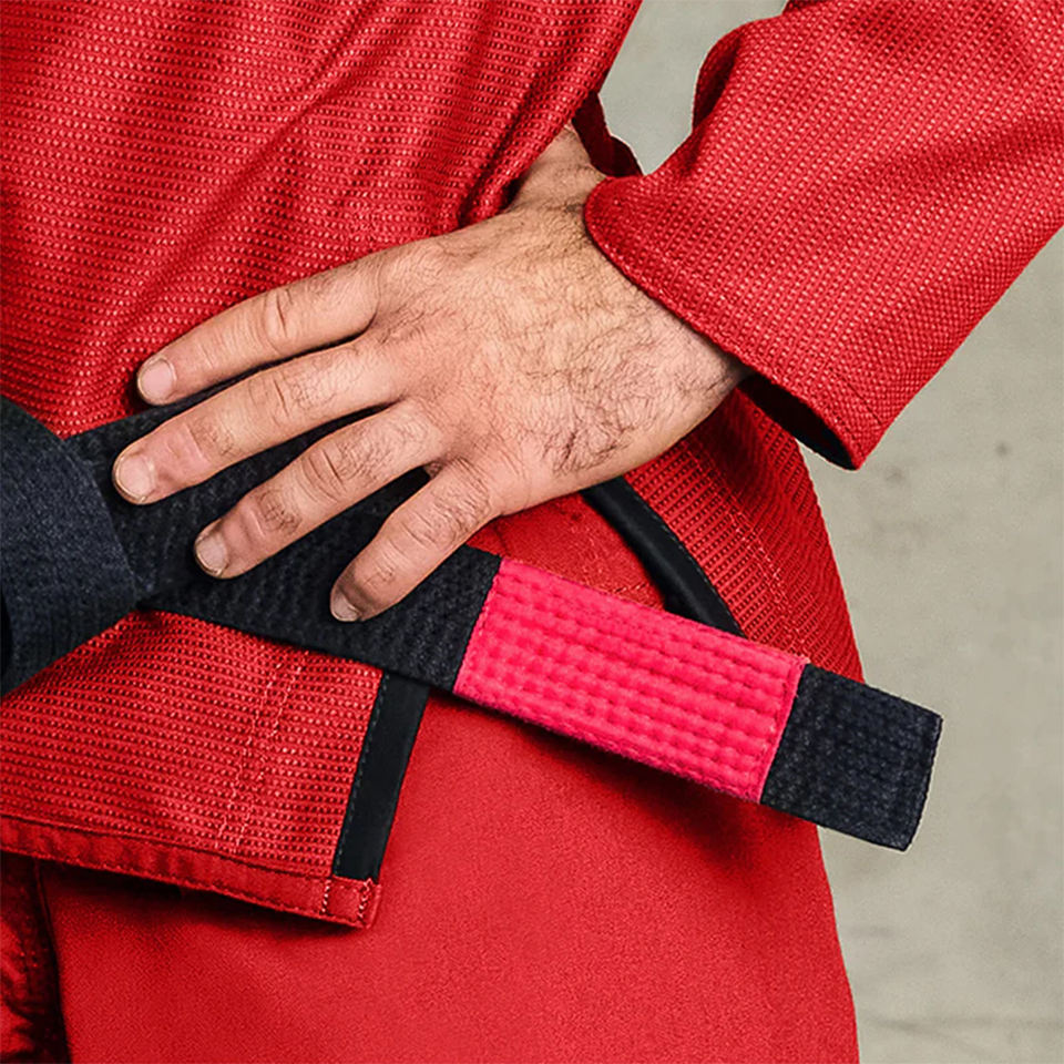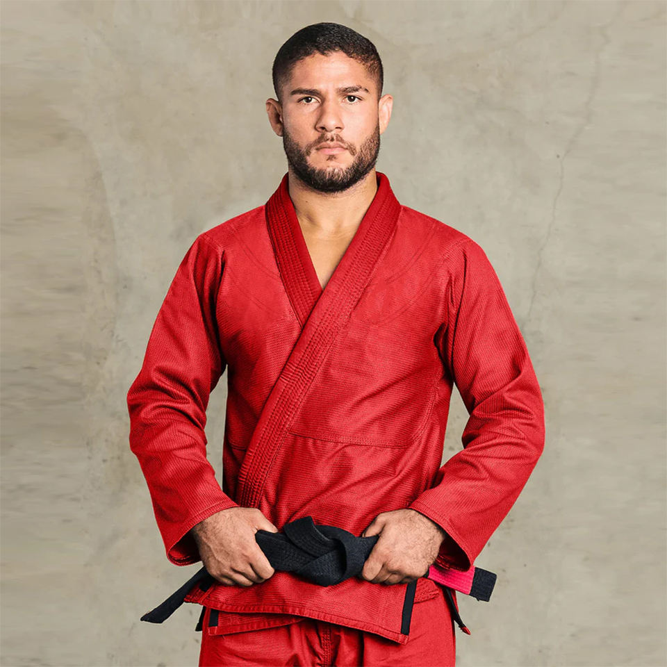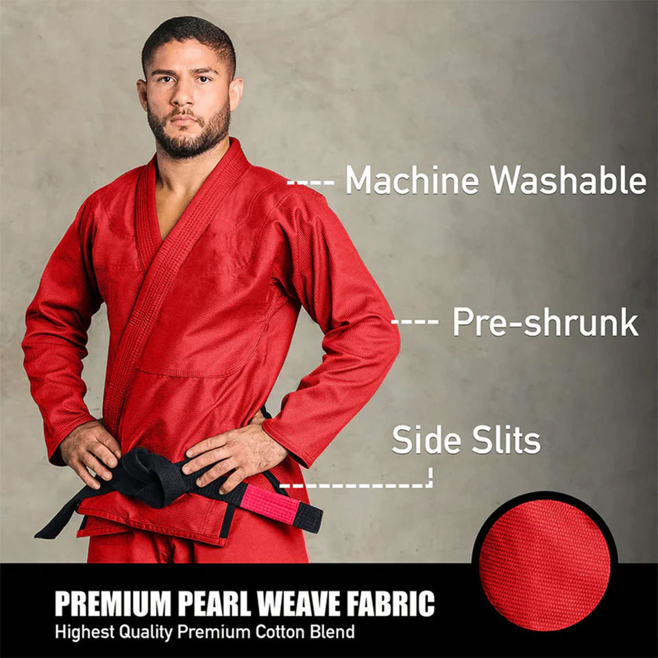 ชุดยิวยิตสูท BJJ สีแดงขายดีที่สุด เนื้อผ้าคอตตอนเพิร์ล น้ำหนักเบา ระบายอากาศได้ดี ปรับแต่งได้ ผ้าหดตัวแล้ว พร้อมช่องผ่าด้านข้าง เข็มขัดสีดำ