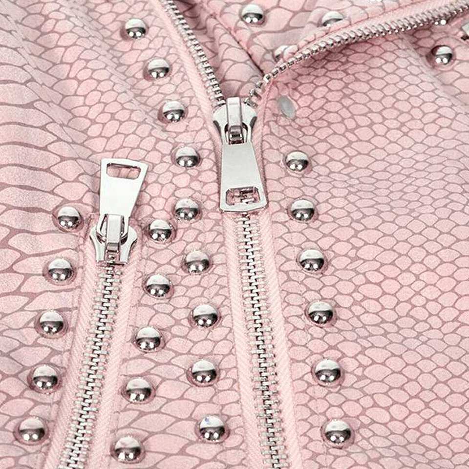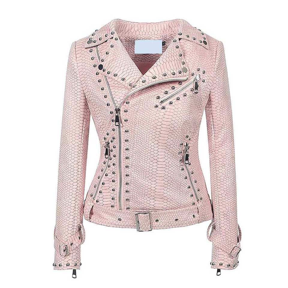 แจ็คเก็ตหนังผู้หญิงขายดีประจำฤดูหนาว แจ็คเก็ตหนังผู้หญิงแบบถักสั่งทำสีได้ คอตั้ง กันน้ำ ประดับหมุด