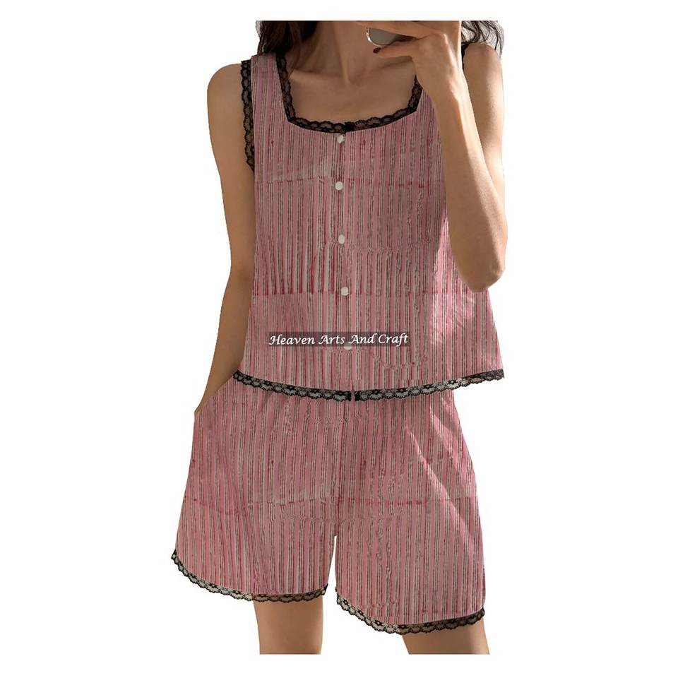 ชุดนอนขาสั้นผ้าฝ้ายแท้พิมพ์ลายบล็อกตกแต่งลูกไม้สำหรับผู้หญิงขายดี ชุดนอนแขนกุดลายดอกไม้สำหรับฤดูใบไม้ผลิ/ฤดูร้อน พิมพ์ลายด้วยมือ