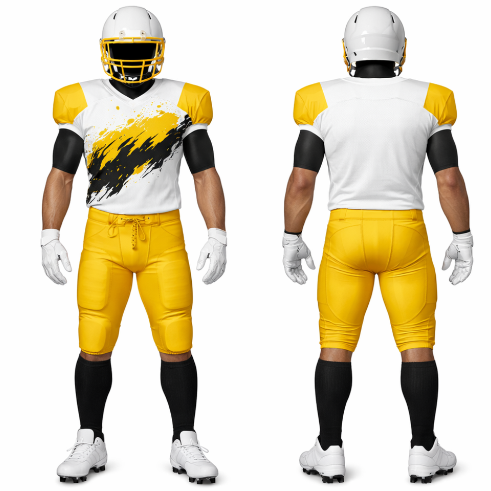 ชุดยูนิฟอร์มอเมริกันฟุตบอลสีเหลืองดำขายดี แบบซับลิเมชั่น พร้อมเสื้อทรงสลับและกางเกงบุฟองน้ำ