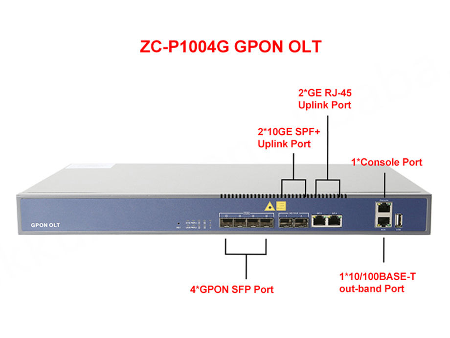 ZC-P1004G ความสูงของ1U พอร์ต4-GPON OLT 2 * Ge (RJ-45)+ 2 * Ge (SFP)/10GE(SFP +) พอร์ต Uplink