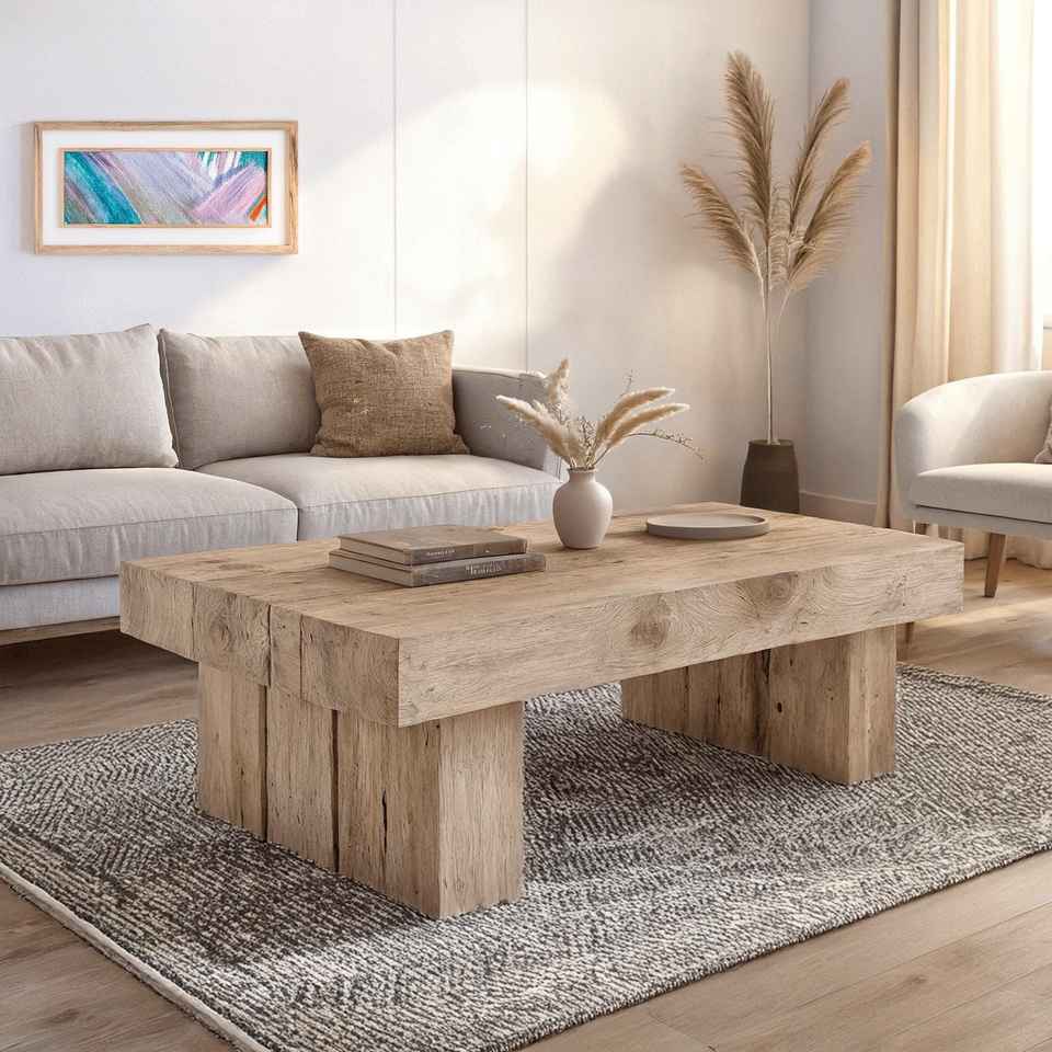 โต๊ะกาแฟไม้เนื้อแข็งที่ดีที่สุด พร้อมท็อปทรงสี่เหลี่ยมหนา ฐานทรงบล็อกขนาดใหญ่ และผิวไม้สีธรรมชาติอ่อน สำหรับห้องนั่งเล่นสไตล์โมเดิร์น