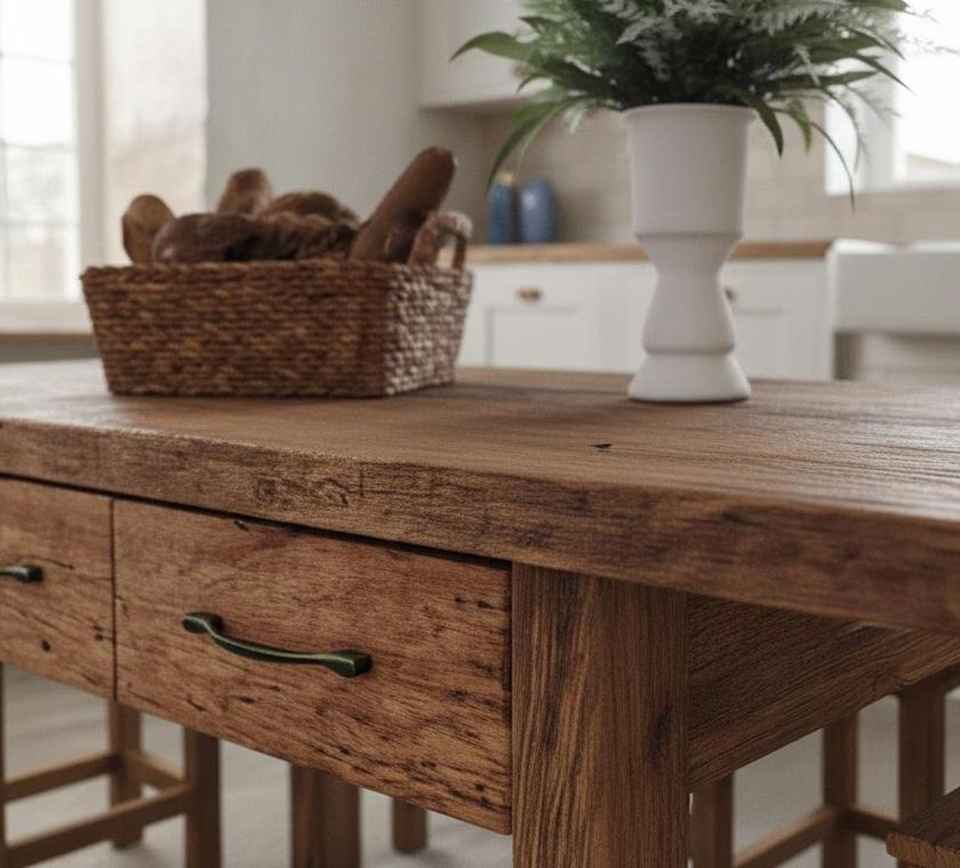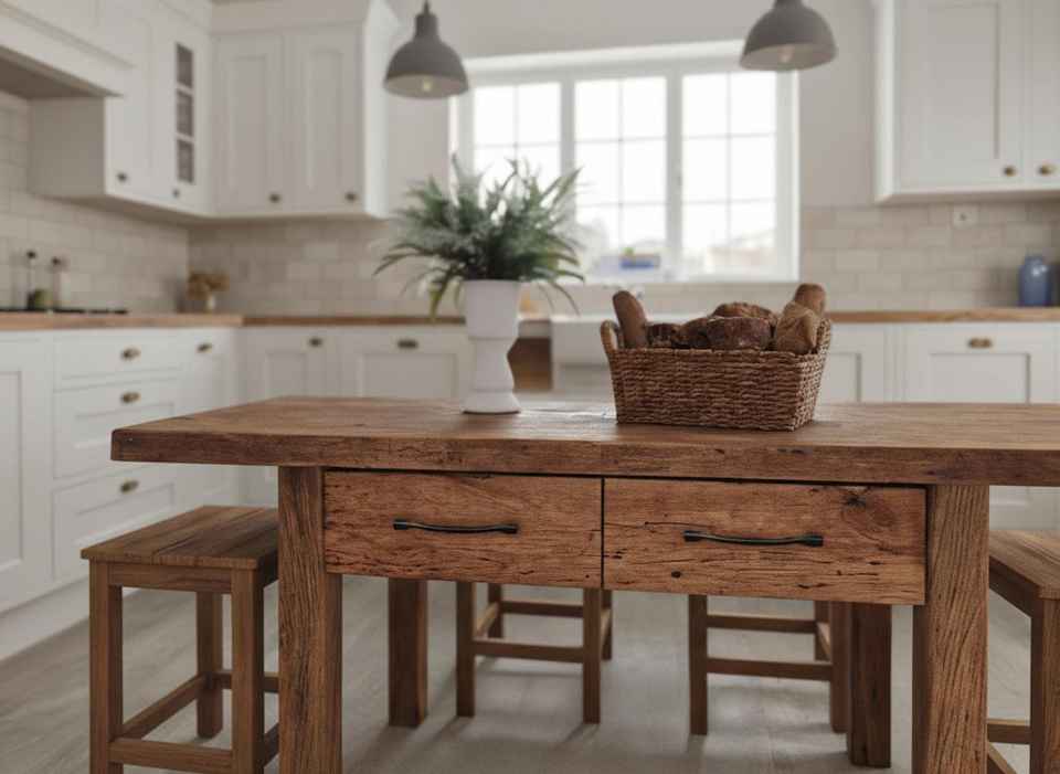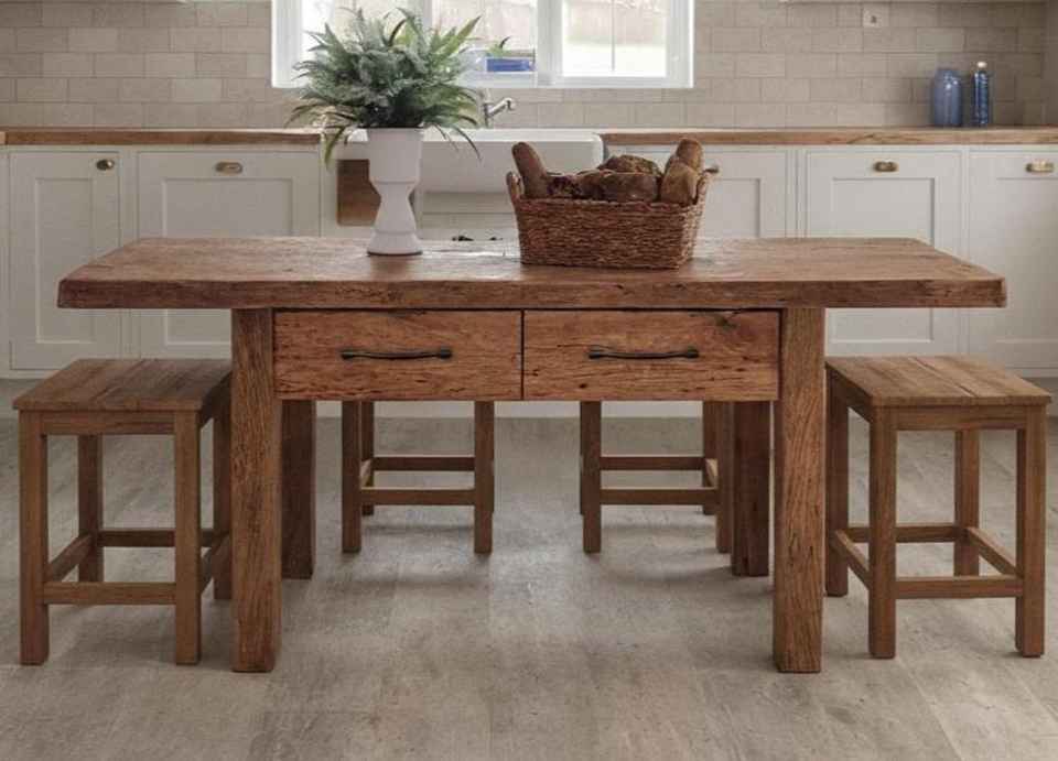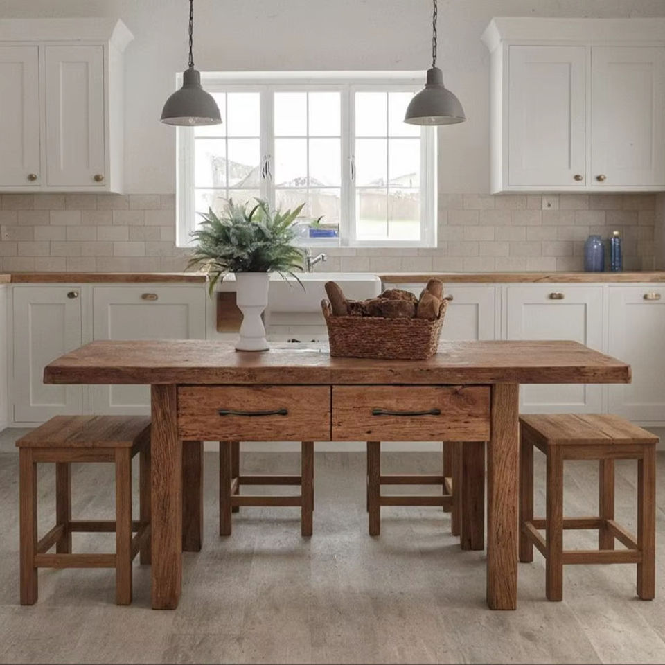 โต๊ะรับประทานอาหารไม้เนื้อแข็งคุณภาพดี พร้อมลิ้นชักเก็บของในตัว ชุดเฟอร์นิเจอร์ครัวสไตล์บ้านไร่แบบเรียบง่าย พร้อมม้านั่งไม้เข้าชุด
