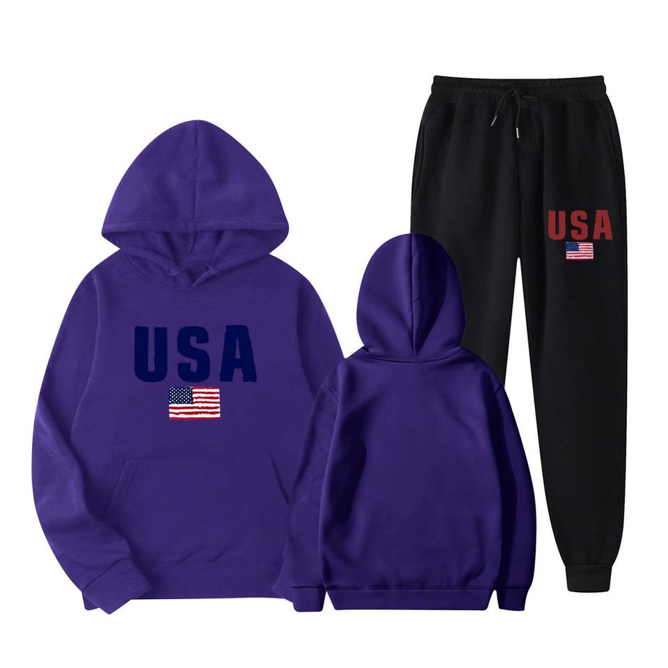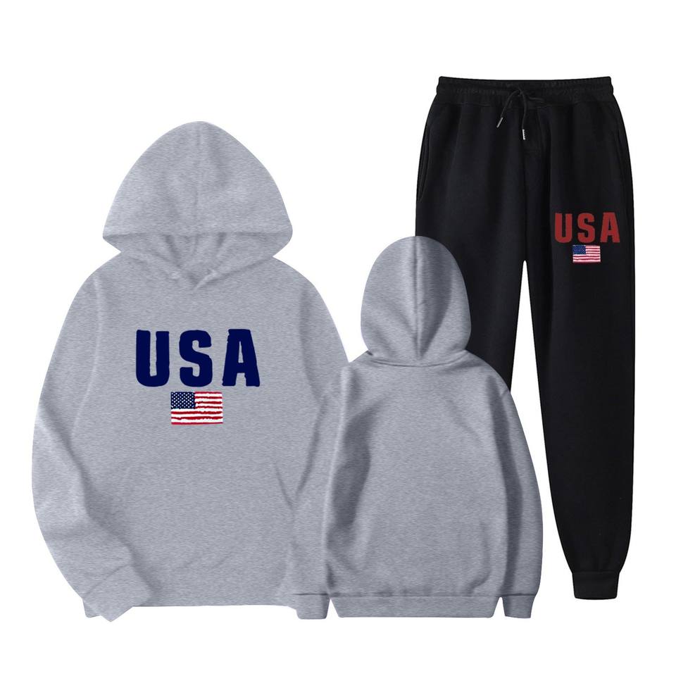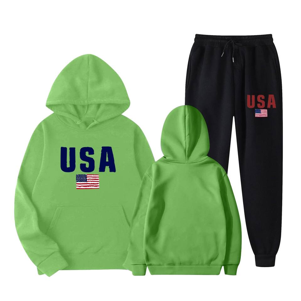 ชุดเสื้อฮู้ดดี้และกางเกงวอร์มลายธงชาติอเมริกาแบบเย็บอย่างดีสำหรับผู้ชายและผู้หญิง สีชมพู เขียว ขาว และดำ ชุดลำลอง