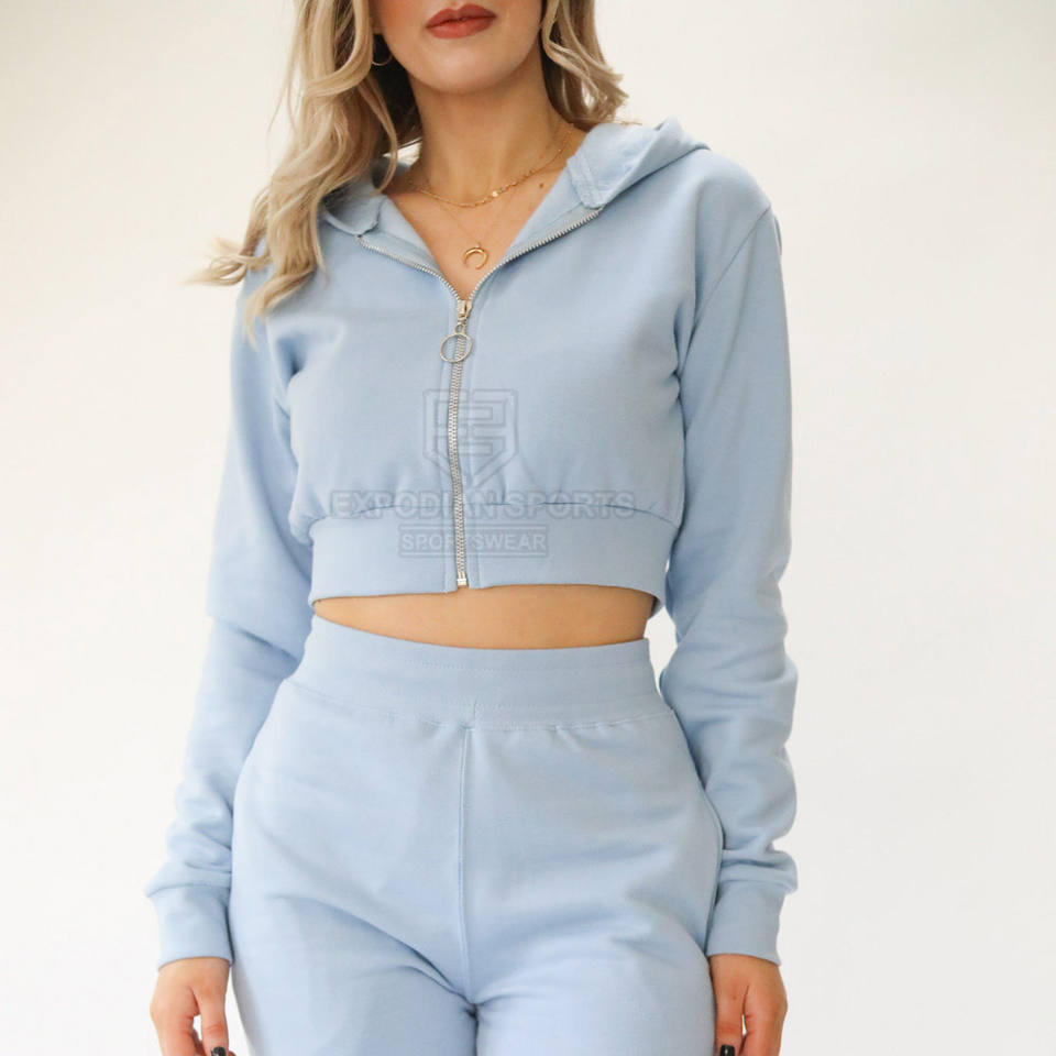 ชุดครอปแบบมีซิปสำหรับผู้หญิงชุดวิ่งแบบลำลองสีพื้น100% ผ้าฝ้ายระบายอากาศเป็นมิตรกับสิ่งแวดล้อมผลิตในปากีสถาน