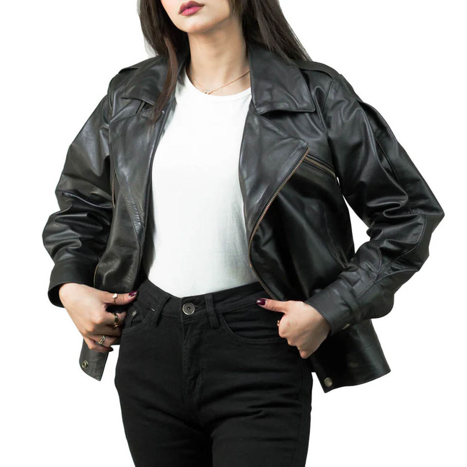 แจ็กเก็ตไบค์เกอร์หนังแท้สีดำคลาสสิกสำหรับผู้หญิงแจ็คเก็ตหนังแท้รุ่นสั้นของ Moto